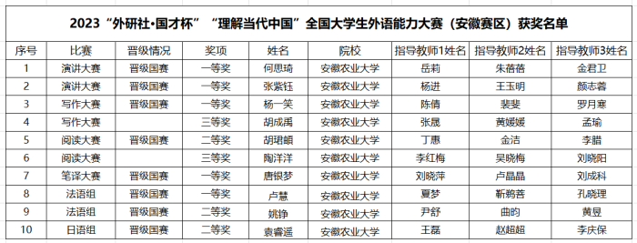 本网讯 近日,由安徽省教育厅主办、蚌埠医学院承办的2023“外研社·国才杯”“理解当代中国”全国大学生外语能力大赛安徽赛区比赛结果公布,我校外国语学院教师指导学生在比赛中共获一等奖5项、二等奖3项、三等奖2项,同时拿到了8张晋级国赛的入场券,总体成绩在全省高校中名列前茅。