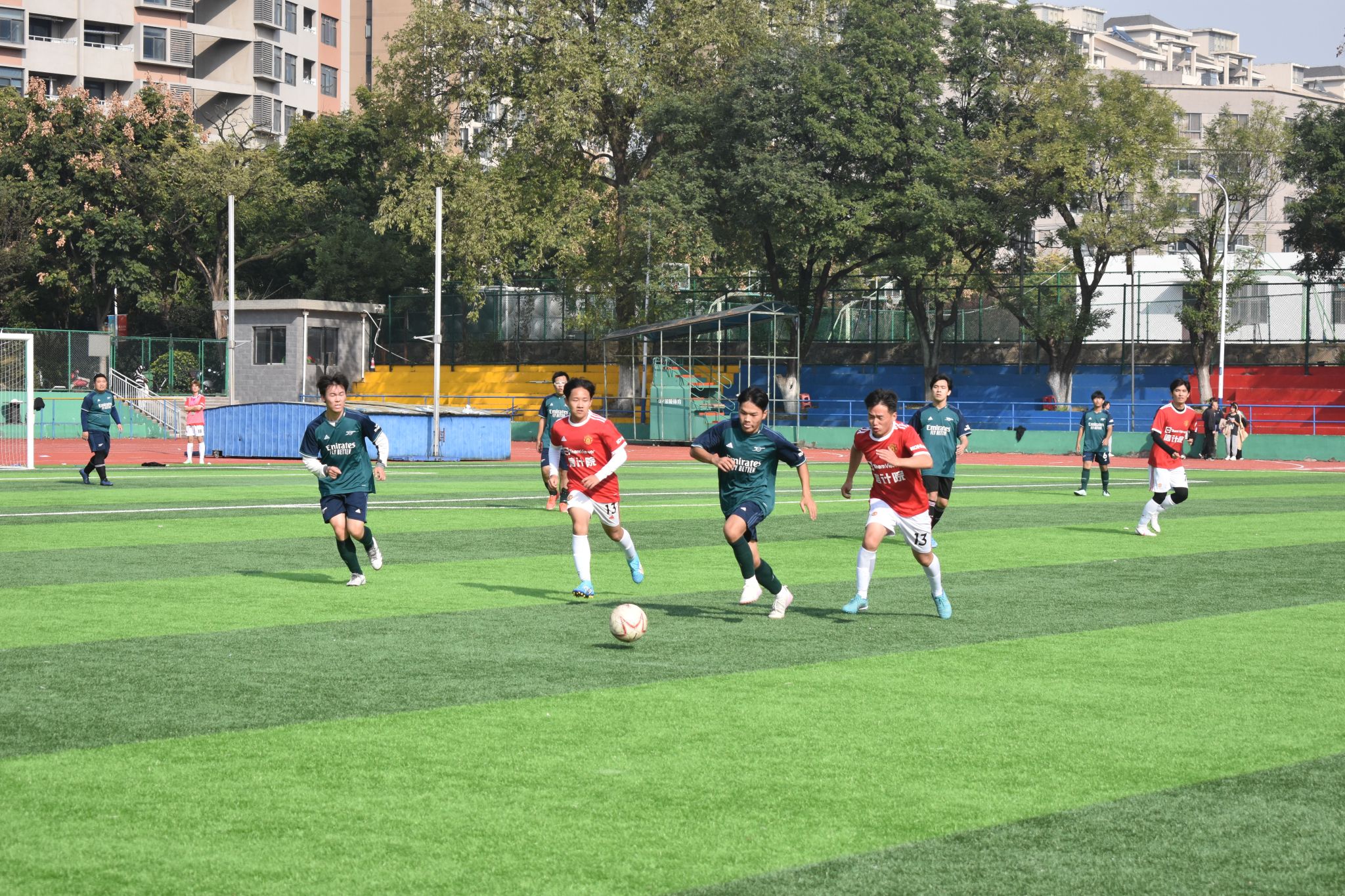 伴随着冬日的暖阳、高昂的国歌,双方球员入场。主裁吹响开赛哨声,比赛拉开了帷幕。整场比赛,双方队员进攻主动,凭借出色的团队配合和精准的传球,多次打破对方防线。上半场,双方队员先后攻入一球,1:1战平。下半场第36分钟,信息与人工智能学院队员在对方禁区内成功抢断,制造了一次点球机会,对方的门将反应迅速,飞身扑出,13号队员机敏地跟上补射,一脚将球送入空门。最终,信息与人工智能学院以2比1的总比分赢得了比赛的胜利。双方队员展现出的顽强精神和团队合作也赢得了观众们的尊重和喝彩。