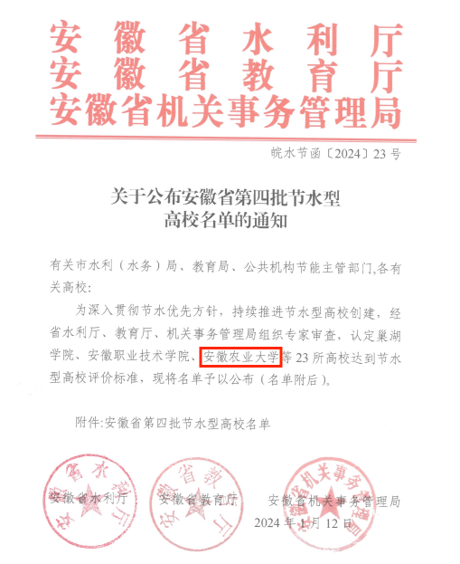 本网讯 近期,安徽省水利厅、教育厅、机关事务管理局对我校节水型高校创建进行了验收,公布安徽省第四批节水型高校名单,我校位列其中。