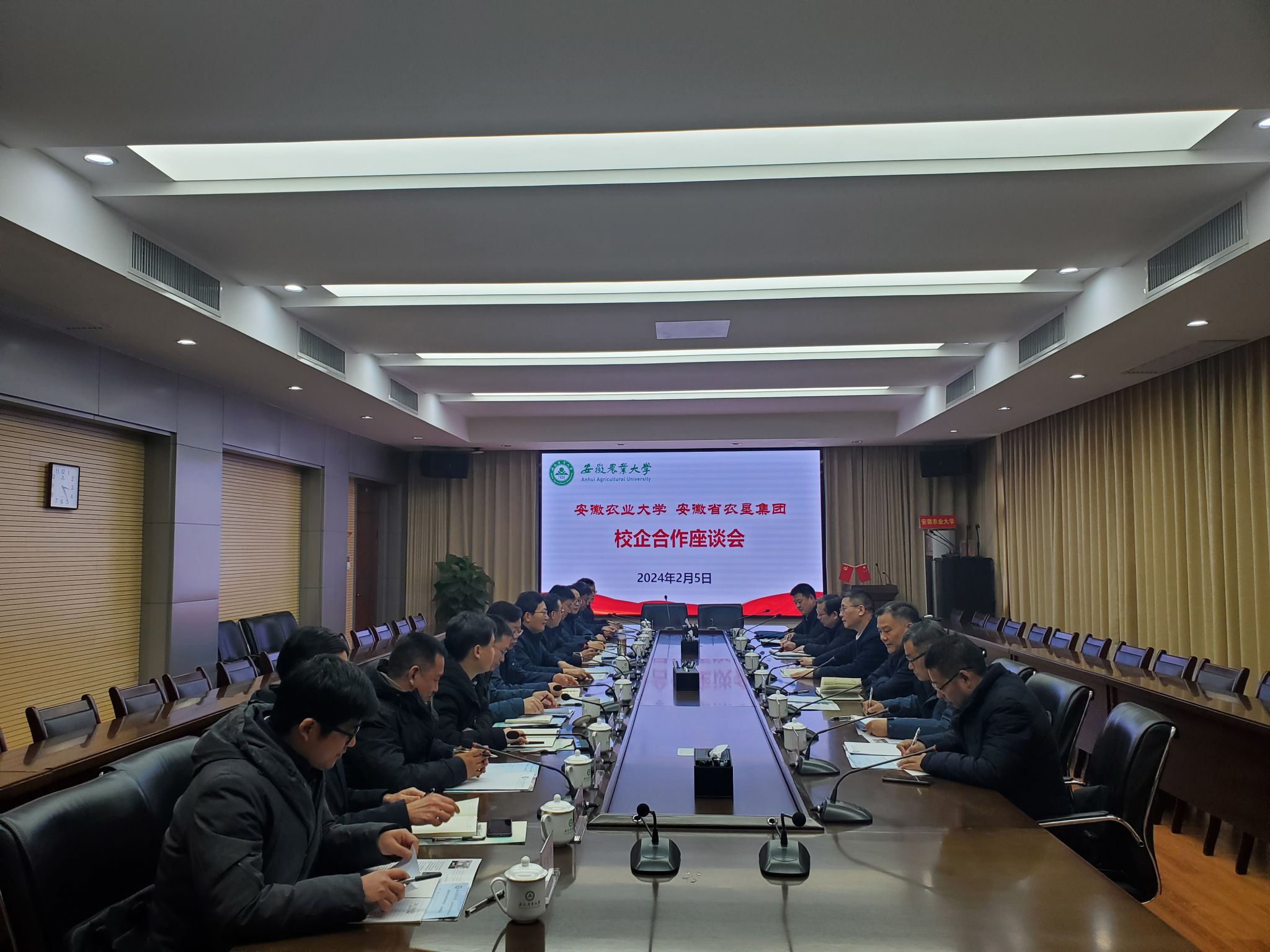 本网讯 2月5日,安徽省农垦集团党委副书记、总经理张其广,总农艺师姚礼发,党委委员、皖垦种业公司党组书记、董事长陈军一行来校对接合作与座谈交流。校党委书记张庆亮,校党委常委、副校长操海群参加座谈交流会。