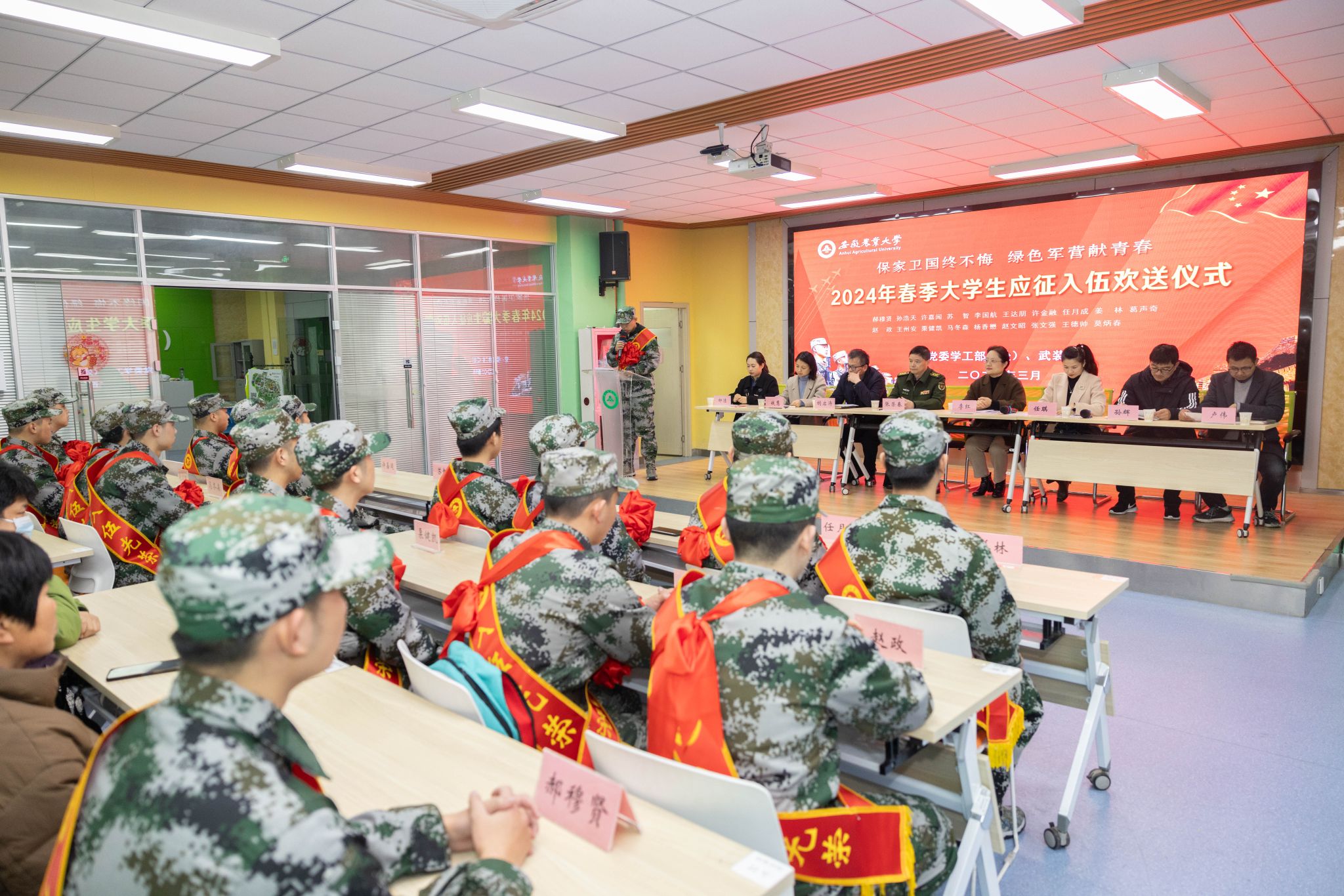 本网讯 3月4日下午,我校在大学生创客空间举行2024年春季大学生入伍欢送仪式。校党委常委、副校长李红,蜀山区人武部上校部长张荣春,宣传部、教务处、学工部(处)、武装部、校团委、继续教育学院等单位负责人,各学院副书记,入伍学生和辅导员及家长代表近百人参加欢送会。