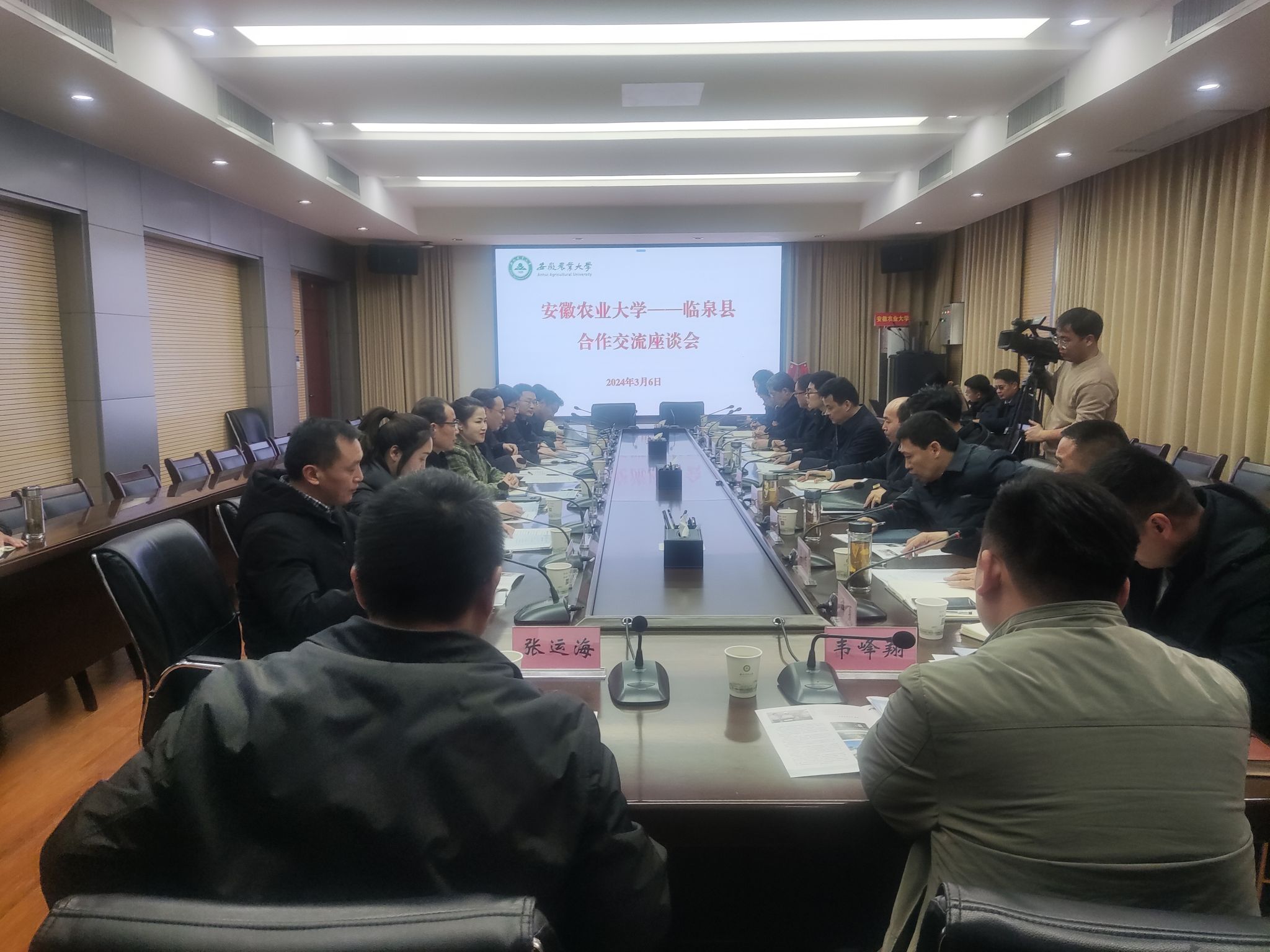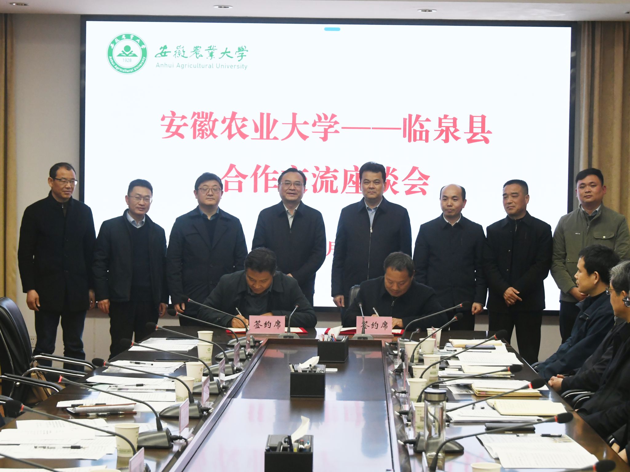 座谈会上,学校专家与服务企业签署了项目合作协议,临泉县农业农村局、皖西北综合试验站负责人分别汇报了校县合作情况及2024年重点工作事项,与会人员进行了交流座谈。