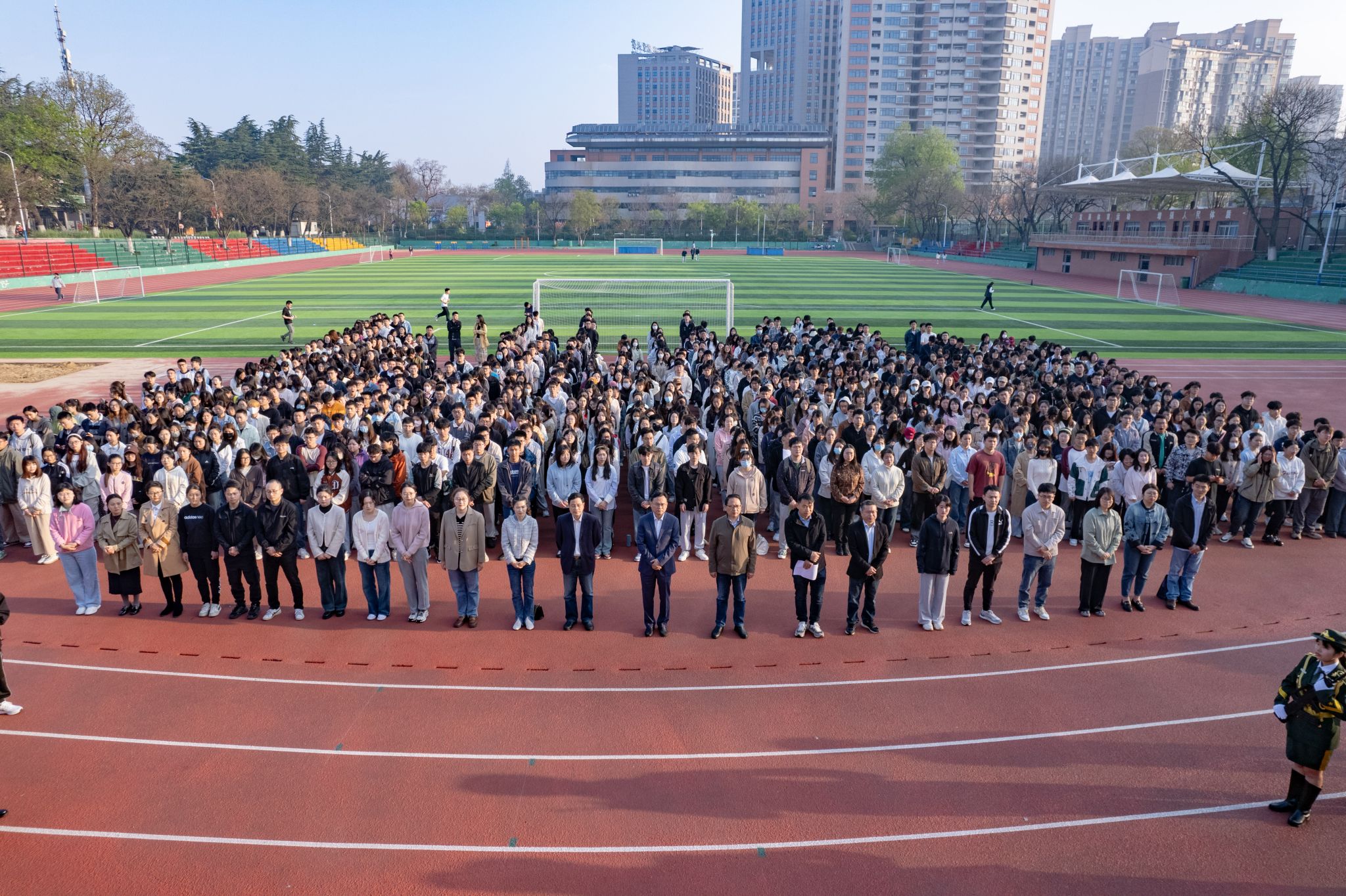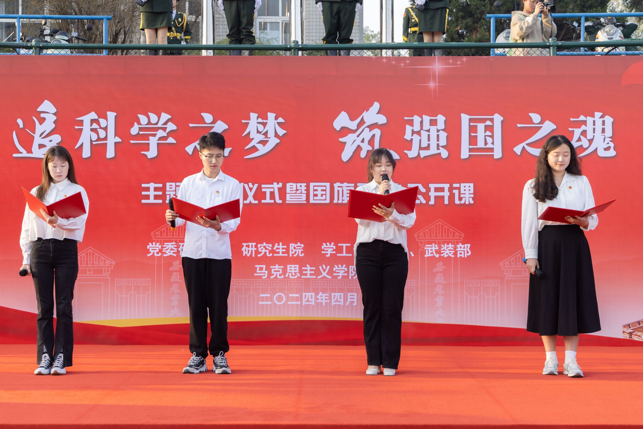 本网讯 4月1日,我校党委研工部、研究生院在第一运动场举办“追科学之梦,筑强国之魂”升旗仪式暨国旗下的公开课。校党委常委、副校长操海群,党委学工部(处)、武装部、马克思主义学院等单位主要负责人出席活动。校党委研工部、研究生院全体教职工、各学院研究生辅导员,校研究生会、研究生管理服务中心、各学院研究生代表及马克思主义学院全体学生等1000余人参加此次活动,活动由研工部主要负责人主持。