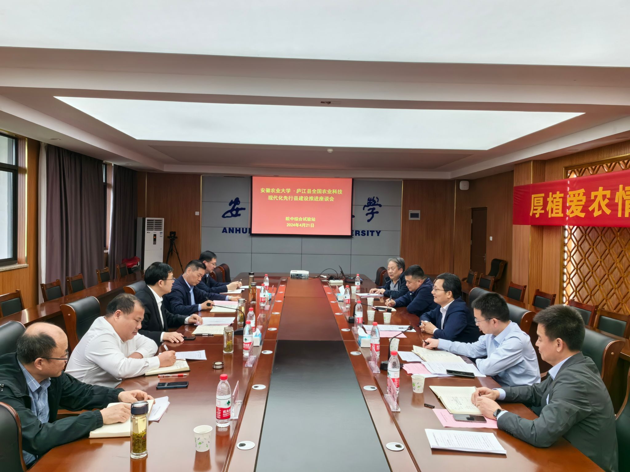 本网讯 4月21日下午,我校与庐江县在皖中综合试验站召开全国农业科技现代化先行县合作共建工作推进会。校党委书记张庆亮,庐江县委副书记、县长周天斌,副县长俞德胜出席会议。我校党政办、社会合作处、新校区指挥办公室、庐江县农业农村局等负责同志参加了会议。