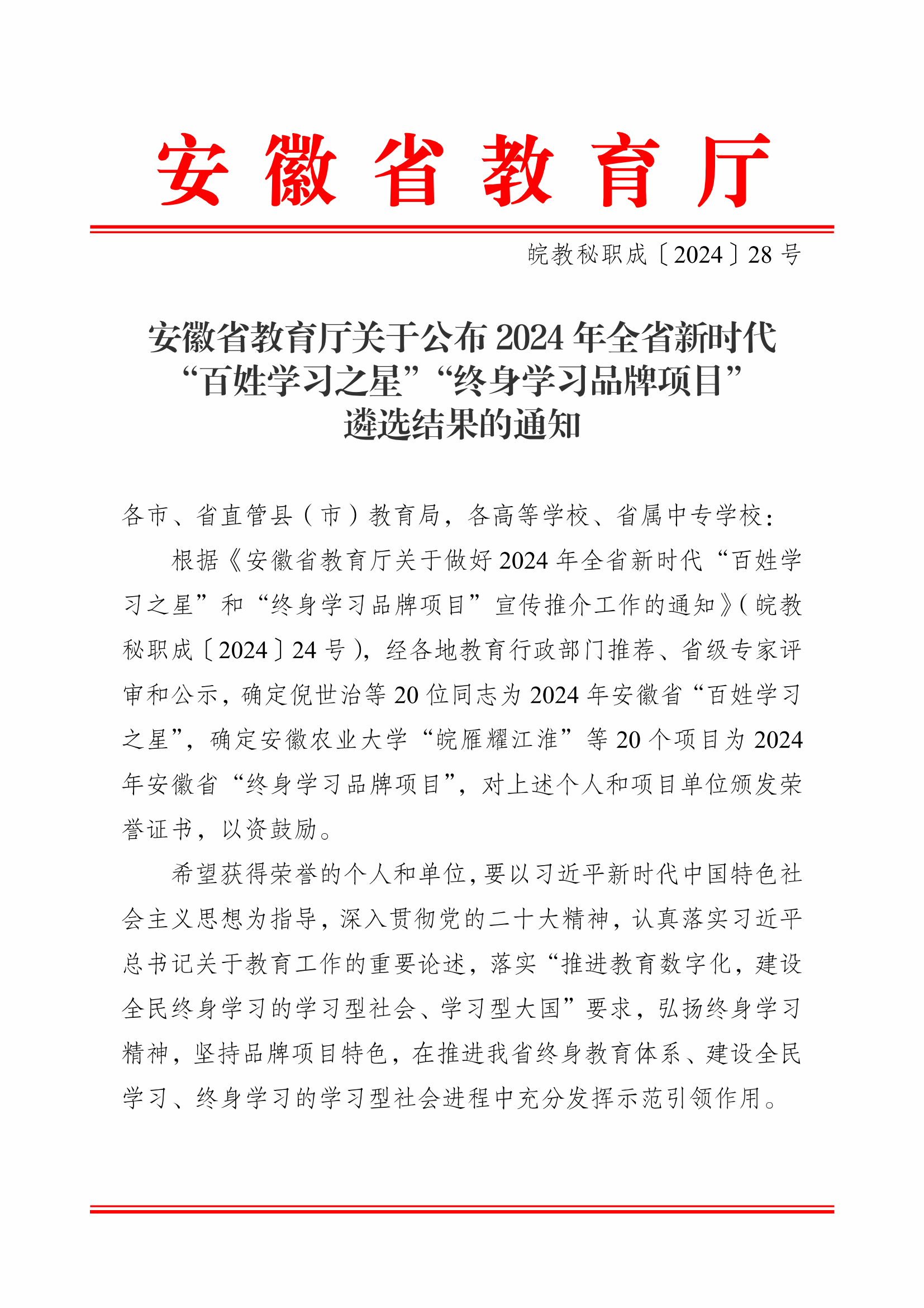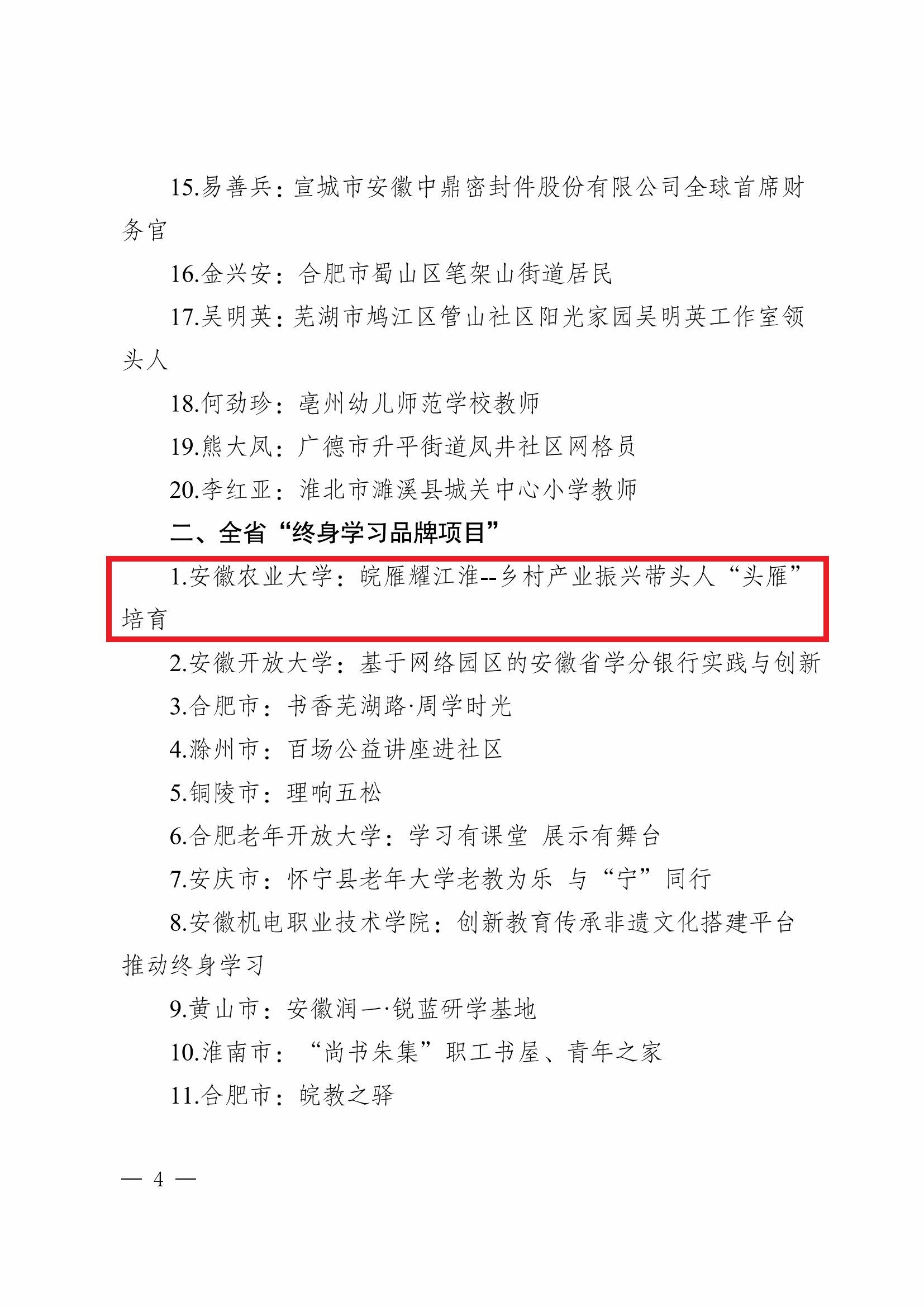 本网讯 近日,安徽省教育厅下发通知,公布2024年全省新时代“百姓学习之星”“终身学习品牌项目”名单,我校乡村振兴学院、继续教育学院申报的“皖雁耀江淮—乡村产业振兴带头人‘头雁’培育”项目获评2024年全省“终身学习品牌项目”。