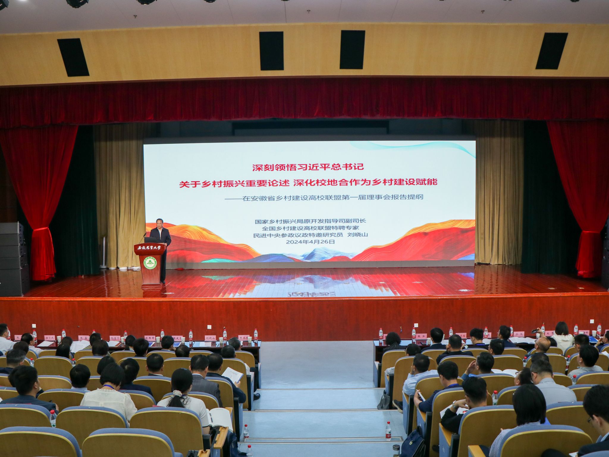本网讯 4月26日上午,安徽省乡村建设高校联盟第一届理事会在我校第一报告厅举行。国家乡村振兴局原开发指导司副司长、乡村建设高校联盟知名专家刘晓山,乡村建设高校联盟秘书长、清华大学建筑学院党委副书记张弘,乡村建设高校联盟秘书处外联部长李志信,安徽省农业农村厅副厅长、安徽省乡村振兴局局长朱永东,安徽省教育厅二级巡视员周晓芹以及乡村建设高校联盟成员高校有关负责人出席会议。校党委常委、副校长操海群主持会议。