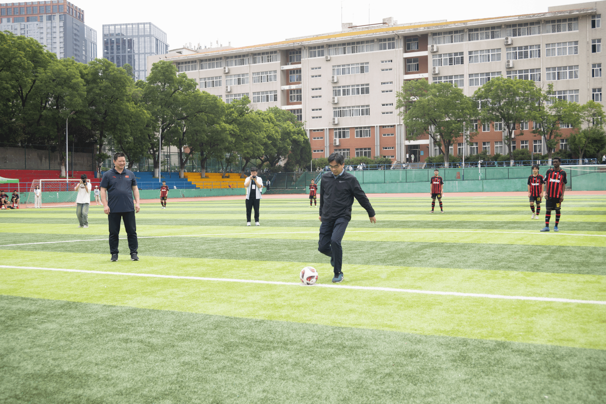 本网讯 5月9日中午,安徽农业大学第三十二届“神农杯”足球赛在第一运动场盛大开幕。校党委常委、副校长蔡德军出席活动,并为揭幕战开球。相关单位负责同志及部分师生参加并观看了比赛。