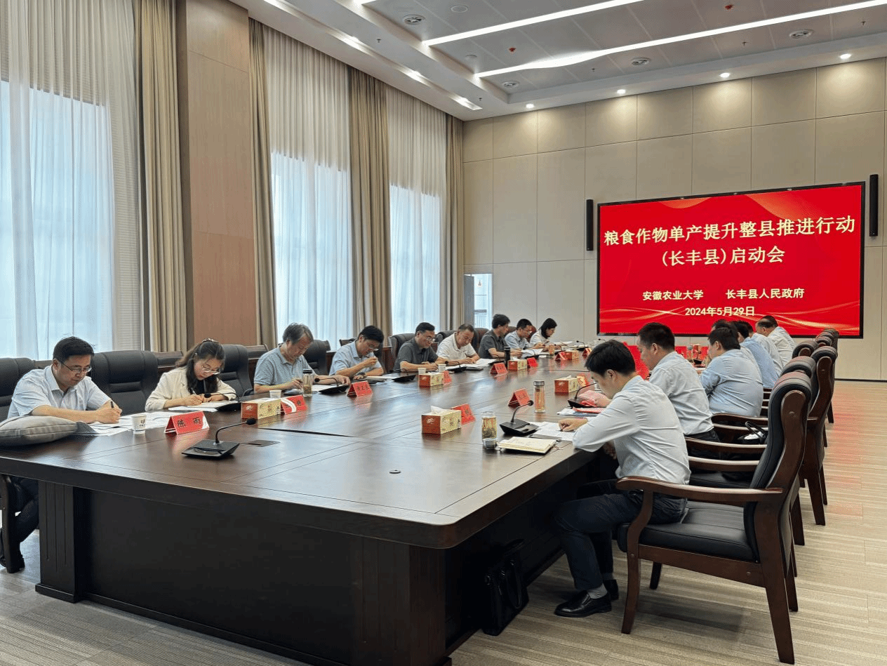 本网讯 5月29日,校党委常委、副校长操海群,学术副校长吴文革带队赴长丰县开展粮食作物单产提升整县推进行动。安徽省农业农村厅二级巡视员张韪,种植业局副局长曹高飞应邀到会指导。合肥市农业农村局局长刘正义、副局长高灿红,长丰县委副书记江浩、副县长王丰参加启动会和陪同调研。