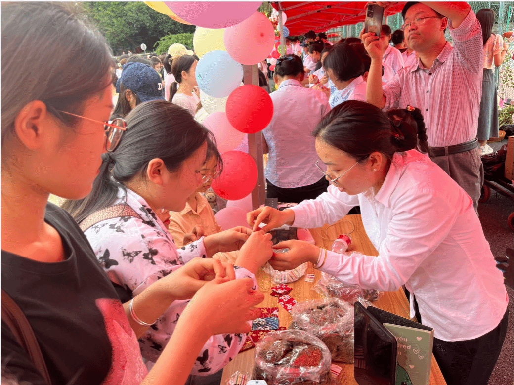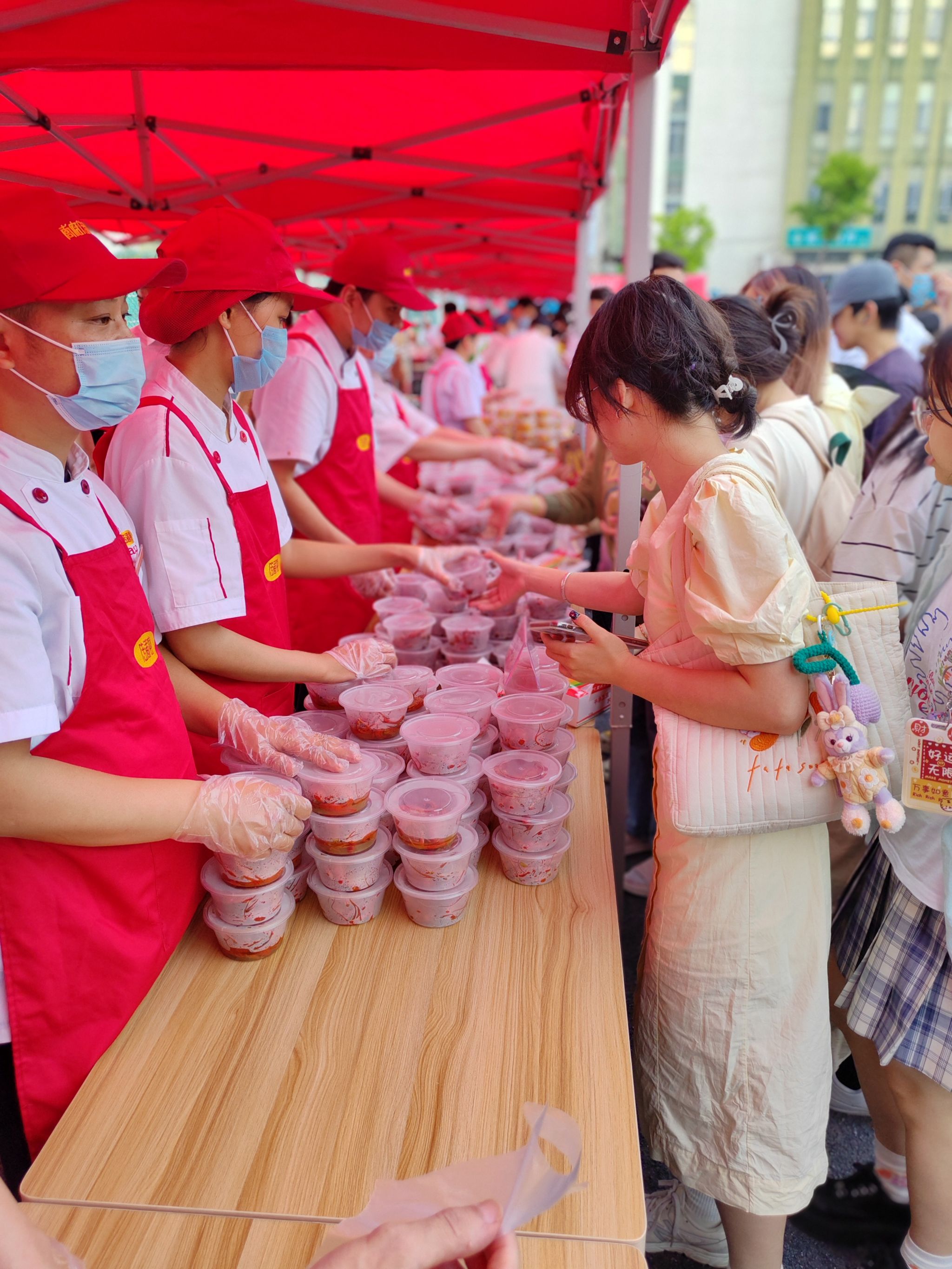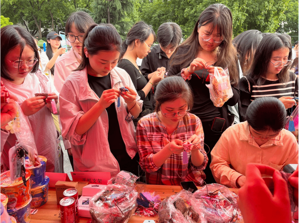 活动现场设置了美食区、手工区和互动区。美食区聚集了东苑、北苑、西苑、欣苑、丰泽和思源等6家学生食堂精心准备的各具特色美食:2000斤小龙虾,蒜蓉的、麻辣的、十三香等口味一应俱全,学生早早锁定自己喜爱的美食,活动开始前一个小时就排起长队;3000份卤烧味和香辣脆皮味的鸡腿,1000多份糕点、2000多份水果拼盘和各类炸串、1000多个多味粽子,多方位满足学生的味蕾,大家直呼看的过瘾,吃的解馋。在手工区,宏德、鹏辉等2家学生公寓物业员工手把手教授学生制作了爱心香包、艾草花环、五彩绳。在互动区,长城、保利等2家校园物业开展有奖竞猜、扔飞镖、套圈、投壶等活动,滨彩纷呈。