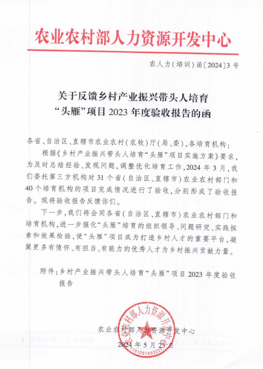 本网讯 6月5日,农业农村部公布了2023年乡村产业振兴带头人培育“头雁”项目评价考核结果,我校获得优秀等次,在全国40所培育机构中排名第八,连续两年位居全国前列。
