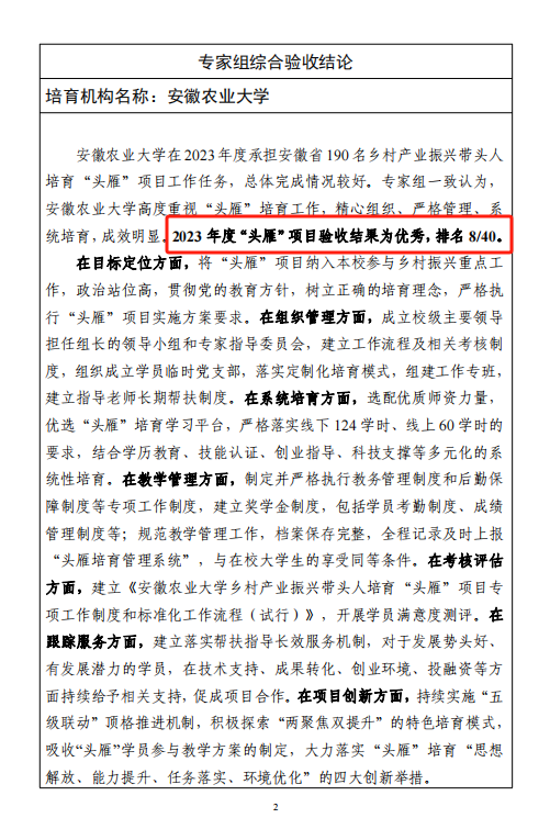 开展“头雁”培育机构考核评价是农业农村部加强头雁培育工作管理,推动“头雁”培育机构动态调整的重要举措。今年3月,农业农村部委托第三方,通过查阅资料、实地考察、线上答辩、学员评价等多种方式,对2023年全国40家“头雁”培育机构进行了综合评价考核。专家组一致认为,我校高度重视“头雁”培育工作,培育目标明确、教学组织规范、组织宣传有力、培育特色明显、学员满意度高。