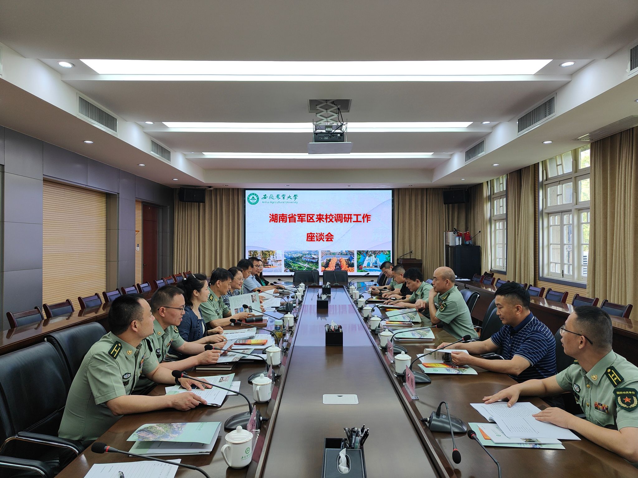 本网讯 6月14日上午,湖南省军区动员局大校局长李道银一行来校调研大学生兵员预征预储和征兵工作,合肥警备区大校副司令员何学军,校党委常委、副校长李红及安徽省军区动员局、蜀山区人武部、我校相关部门负责同志陪同调研。