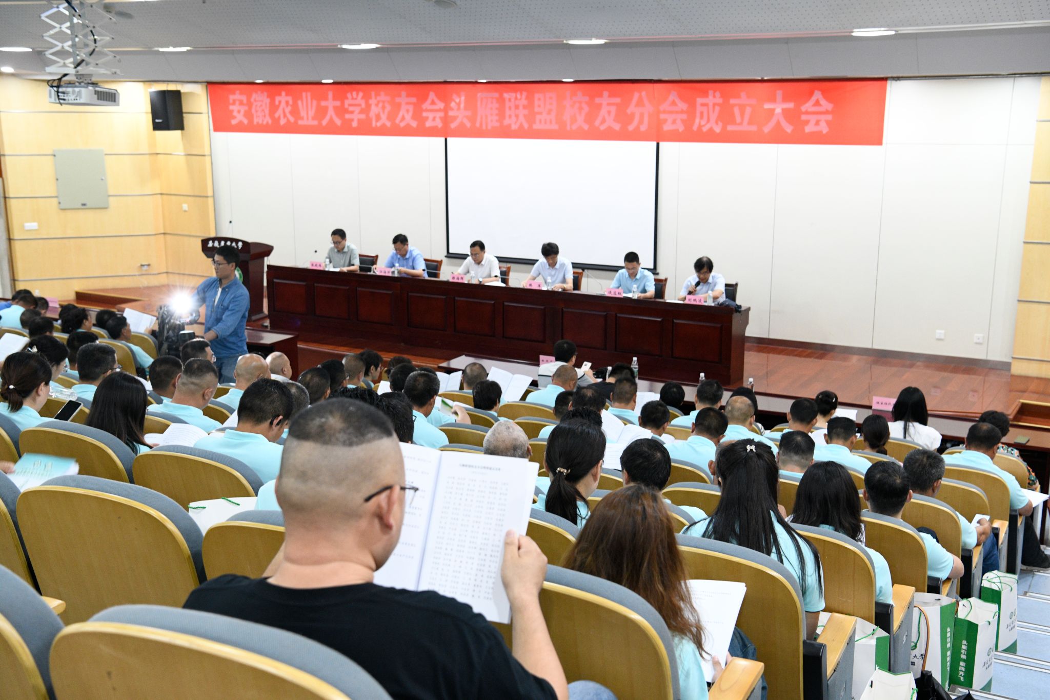 本网讯 7月12日,安徽农业大学校友会头雁联盟校友分会成立大会在图书馆第二报告厅召开。校党委常委、副校长操海群,校友会副会长韩军出席会议。来自全省16个地市140多名乡村产业振兴带头人“头雁”、青年农场主、职业经理人等校友代表,教务处、社会合作处、乡村振兴学院、继续教育学院等单位负责人,“头雁”指导教师、辅导员参加大会。江苏省乡村产业振兴带头人“头雁”发展联盟、安徽农业大学铜陵校友分会向大会发来贺信。