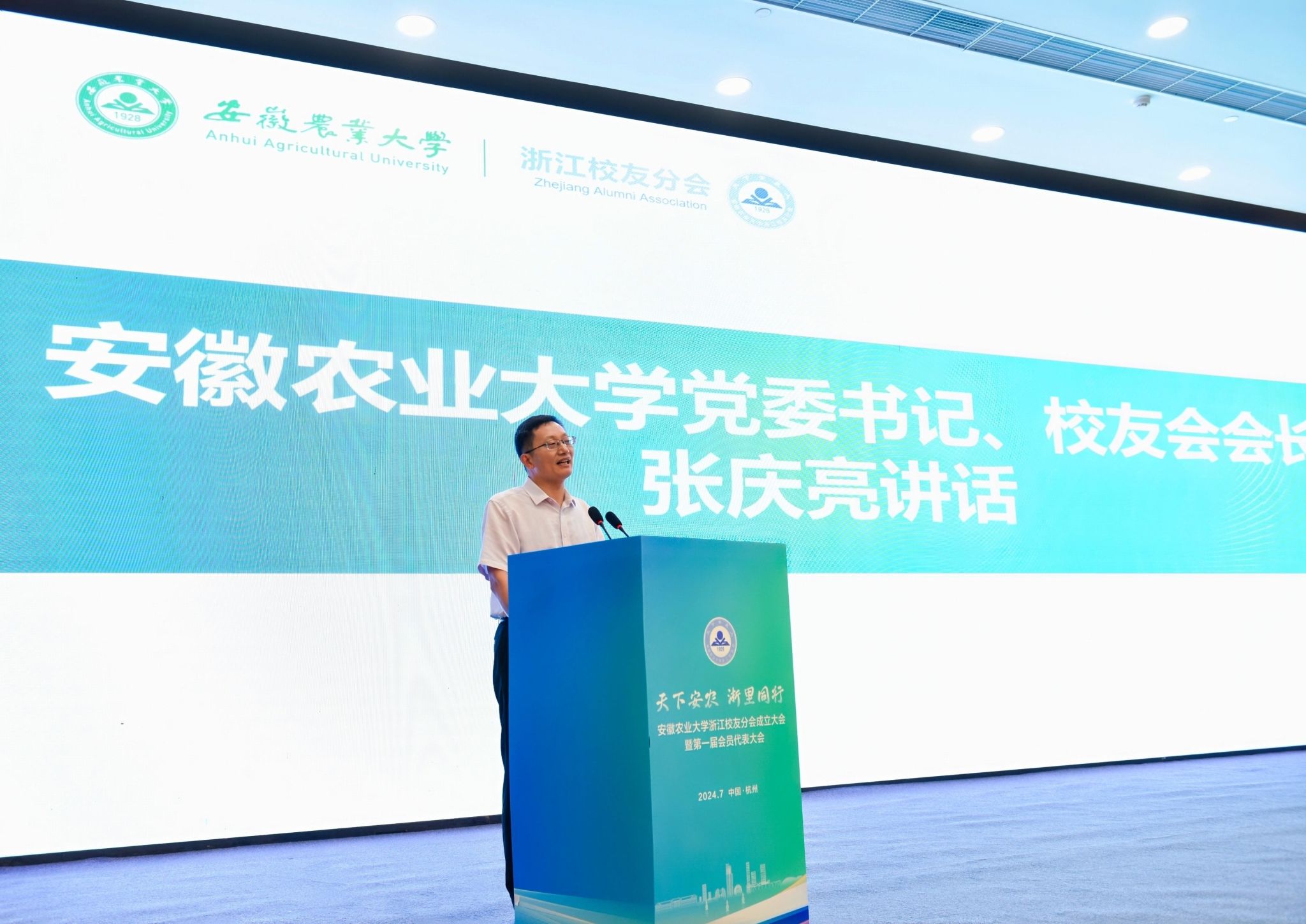 本网讯 7月13日,浙江校友分会成立大会暨第一届会员代表大会在杭州隆重召开。校党委书记、校友会会长张庆亮,校党委常委、副校长蔡德军,校教育基金会理事长裴树东,校友会副会长韩军,各地方校友分会代表,兄弟院校在浙校友分会代表,相关部门、学院校友分会负责同志及240余位浙江校友参加了大会。现场气氛热烈,处处洋溢着浓厚的安农情、同窗谊。