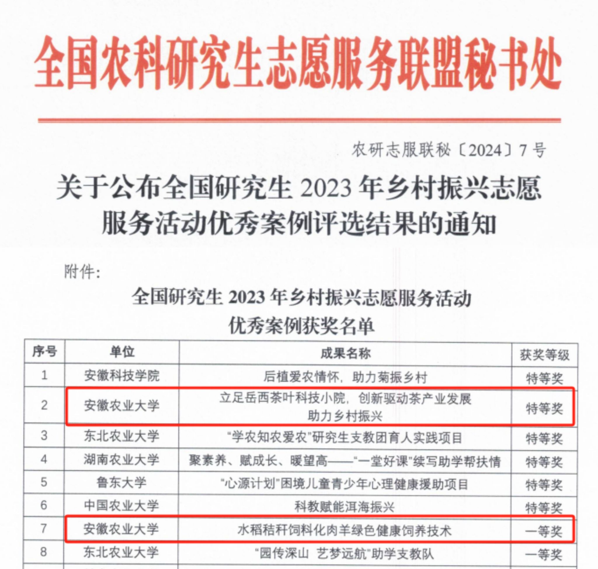 本网讯 近日,全国农科研究生志愿服务联盟秘书处下发了《关于公布全国研究生2023年乡村振兴志愿服务活动优秀案例评选结果的通知》,我校推荐的案例获得特等奖1项,一等奖1项。