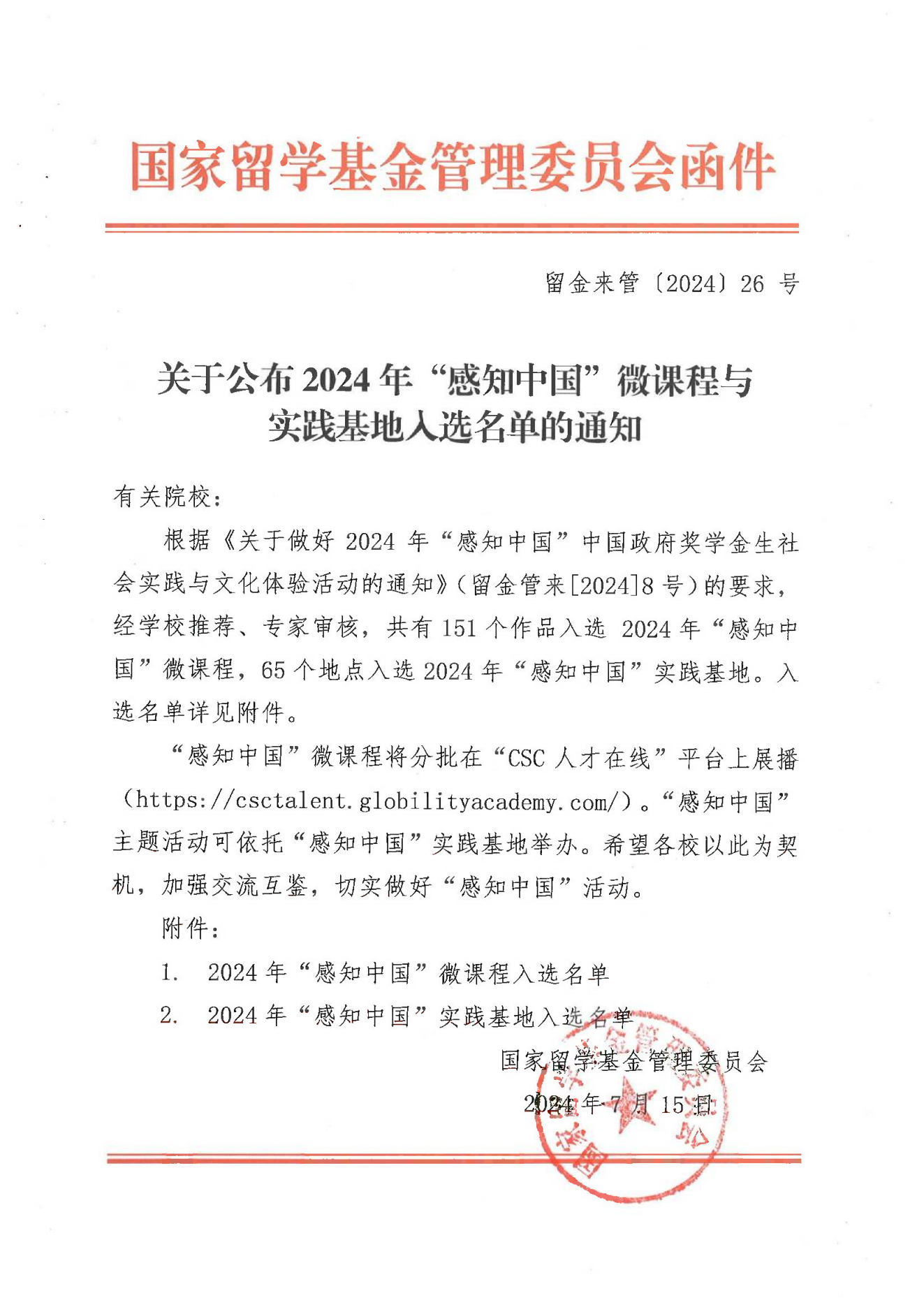 本网讯 近日,国家留学基金管理委员会发布了2024年“感知中国”微课程和实践基地入选名单。我校《汉字书写》和《中国的24节气》成功入选2024年“感知中国”微课程,并将在“CSC人才在线”平台展播。