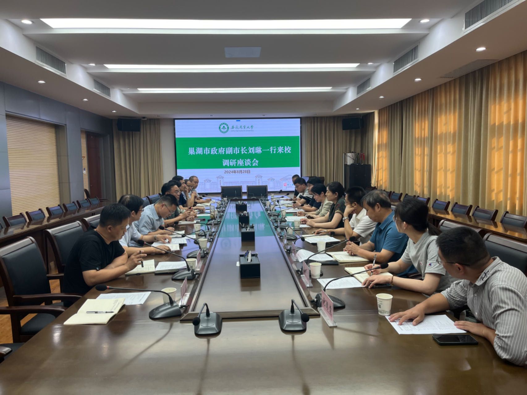 本网讯 8月28日下午,巢湖市政府副市长刘琳一行来校调研,就深化校市合作进行座谈交流。校党委常委、副校长操海群主持会议。