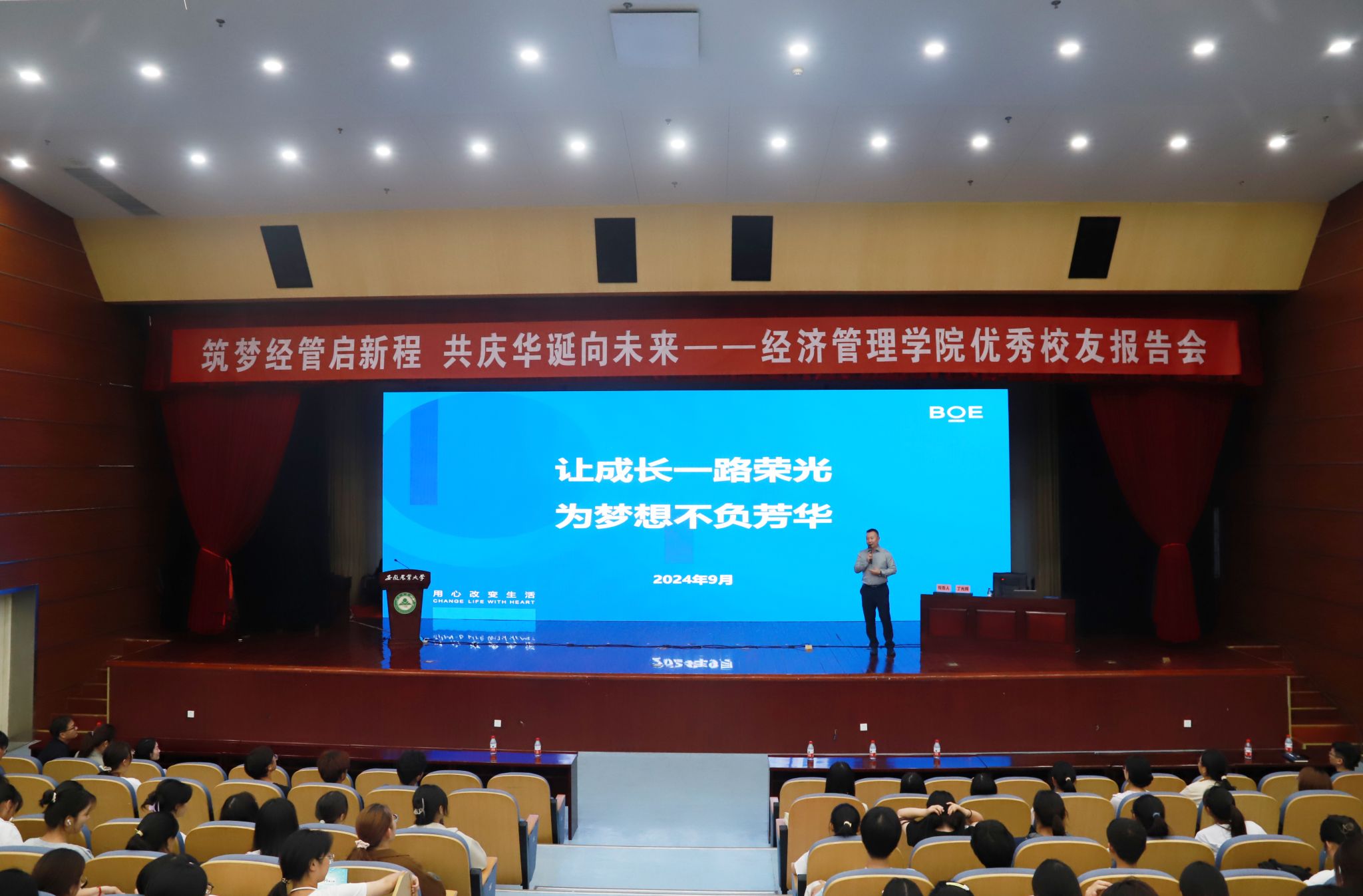 本网讯 9月24日晚,校友会办公室联合经济管理学院在图书馆一号报告厅举办“筑梦经管启新程,共庆华诞向未来”优秀校友专题报告会。2007届公共事业管理专业优秀毕业生、京东方科技集团合肥区域党委书记、总经理丁光辉作专题报告。会前,校党委常委、副校长蔡德军会见了丁光辉,双方围绕人才培养、产教融合及校企合作等进行了座谈交流。