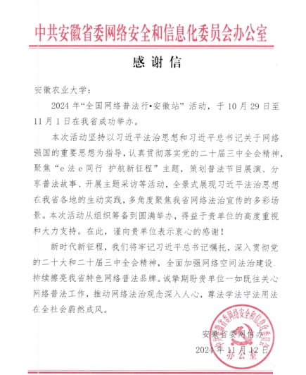 信中指出,2024年“全国网络普法行·安徽站”活动聚焦“e法e同行 护航新征程”主题,策划普法节目展演、分享普法故事、开展主题采访等活动,全景式展现习近平法治思想在我省各地的生动实践,多角度聚焦我省网络法治宣传的多彩场景。我校于10月30日成功举办了2024年“全国网络普法行·安徽站”进校园活动,多形式提升和巩固校园师生的网络安全意识和法律素养。