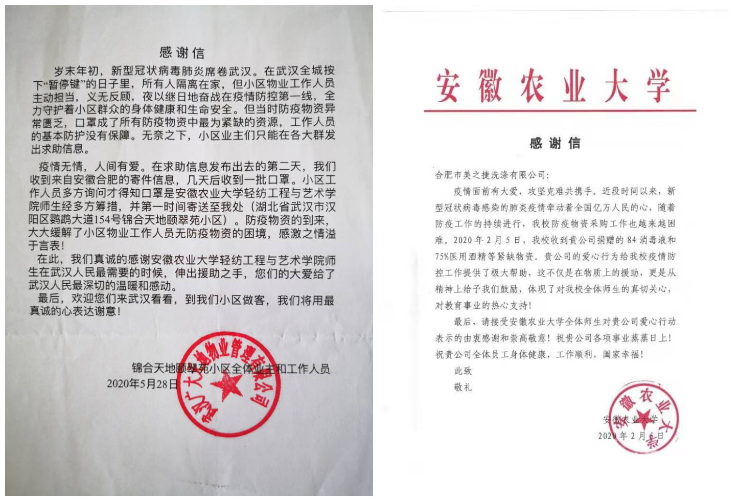 用真心奉献,教师服务做保障。疫情初期,口罩成为紧缺物资,在看到武汉广大天地物业管理有限公司网上求助后,轻纺工程与艺术学院广大师生急他人之所急,在自身口罩缺乏的情况下,通过多方筹措,于今年2月初为该公司捐赠了一批N95口罩,并第一时间送到了锦合天地颐翠苑小区,大大缓解了小区物业工作人员无防疫物资的困境。疫情暴发后,院党委副书记、院长杜兆芳积极联系公共用纺织品洗涤服务标准化委员会为学校捐赠消毒液。同时为保障安徽省少年儿童的生命安全和身体健康,杜兆芳和学院教师刘娜共同参与并制定了安徽省《一次性使用儿童口罩》(T/AQB 1—2020)团体标准。此外,学院教师张玮也积极参与企业出口口罩的图案设计。