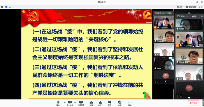 会计系教工党支部书记陆新文以《在抗击疫情的战场上彰显共产党的光辉》为主题,为支部党员带来一场生动的党课。他分享了在这场战“疫”中,看到了党的领导始终是战胜一切艰难险阻的“关键核心”,看到了坚持和发展社会主义制度始终是实现强国复兴的根本之路,看到了依靠和发动人民群众始终是一切工作的“制胜法宝”,看到了冲锋在前的共产党员始终是紧要关头的信心信赖,并就“对比优秀党员,我们应当怎么做”带领党员们进行了热烈讨论。