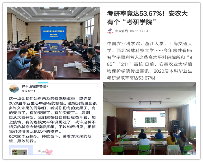 先后召开3次就业工作推进会,研究分析考研、就业情况,落实“包保制”和就业“七条措施”,组织“空中双选会”“一对一”帮扶等。学院考研录取率为53.67%,本科就业率为90.39%。坚持“高标准、高质量”原则,采取线上答辩和线下审核方式,认真完成177名本科、81名硕博士毕业生论文答辩。“顺利完成学业,找到理想的下一站”,同学们自信满满,“感谢安农,让我度过了充实难忘的大学时光”。有的同学在空间动态中写道“毕业快乐,接续奋斗!”大家对未来充满信心。