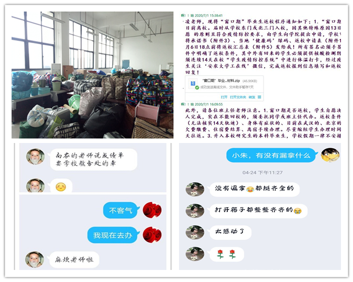 学院坚持疫情防控常态化、服务学生精细化,做实做细安全文明返校离校的服务工作。对136位“窗口期”返校毕业生,制定服务指南,用心帮助学生。成立辅导员和毕业生党员为骨干的志愿服务队,帮助未返校学生办理离校手续、邮寄行李。老师们变身“快递小哥”和“勤务员”,共帮助办理177份材料、寄出82份邮件,在院办公室寄存28位学生行李。
