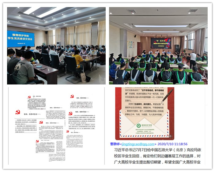 以“云学习”的方式,组织学生认真学习领悟习近平总书记最近给青年大学生“三封回信”重要精神,开展线上交流,教育引导学生坚定理想信念,厚植家国情怀。组织学生党员座谈会,44名毕业班党员递交了大学最后一篇“思想汇报”——《植保,我想对您说……》的一封信,写收获、谈理想、提建议,情真意切。组织召开“‘植’愿有你”毕业生座谈会,表彰省级优秀毕业生和考研学霸宿舍,向学生赠送“心怀植保”毕业纪念章和写满祝福语的千纸鹤。在亲手折叠的纸鹤上,校党委常委、副校长、院长操海群教授写下“梦想成真,‘植’愿你好”,寄语同学们施展才华,逐梦青春,创造价值。