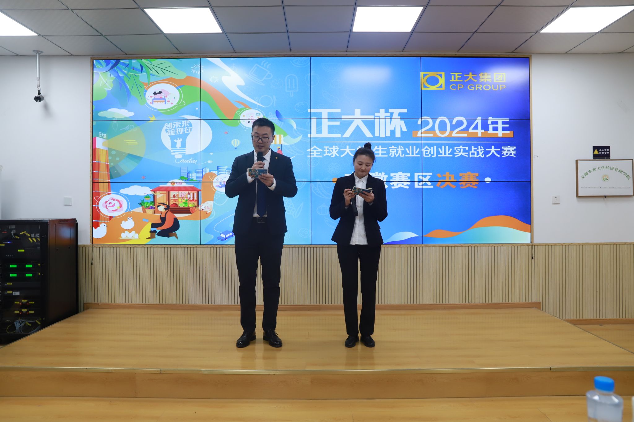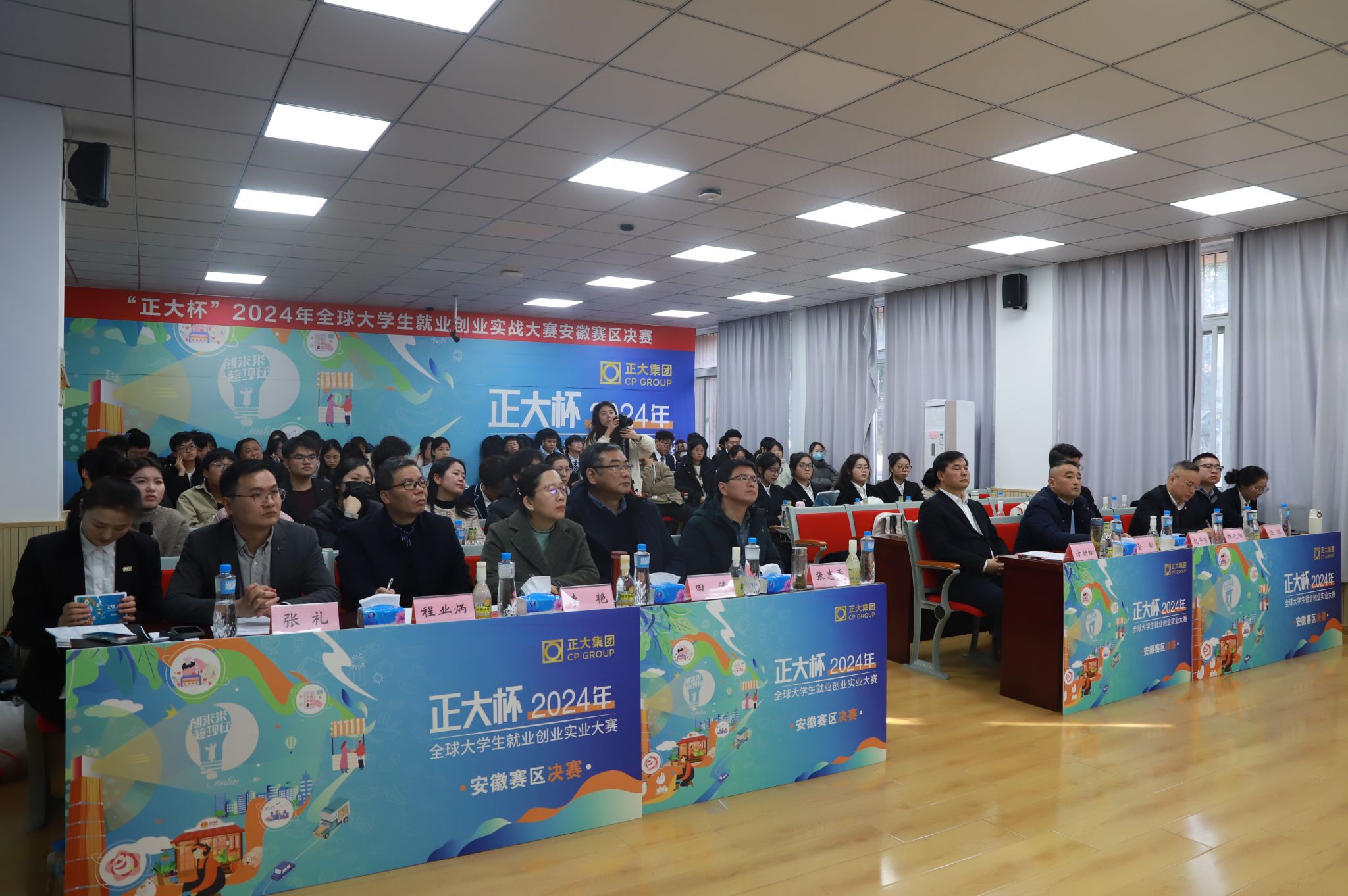 正大集团安徽区食品零售事业副总裁方劲松、中国区人力资源专家中心人才管理总监纪开陈、安徽区人力资源总监林光阳、猪屠宰事业总经理金松、食品事业销售主管张礼、屠宰事业销售主管汪瑞;合肥工业大学食品与生物学院党委副书记兼纪委书记李艳、安徽科技学院管理学院教授程业炳;学校教务处副处长、创新创业学院副院长张志平,经济管理学院副院长田涛出席安徽区总决赛。