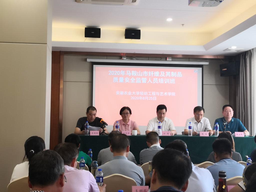 本网讯 为充分发挥学院技术优势对地方发展的推动作用,培养造就一批具有新发展理念的基层实用型专业技术人员。8月25日上午,安徽农业大学轻纺工程与艺术学院“2020年马鞍山市纤维及其制品质量安全人员培训班”开班仪式在马鞍山市举行。马鞍山市市场监督管理局局长何俊、二级调研员焦玉明、安徽农业大学经济管理学院党委书记、院长孙超、轻纺工程与艺术学院党委副书记、院长杜兆芳、轻纺工程与艺术学院党委副书记、副院长吕剑秋以及马鞍山市纤维及其制品质量监管人员出席开班仪式。会议由焦玉明主持。