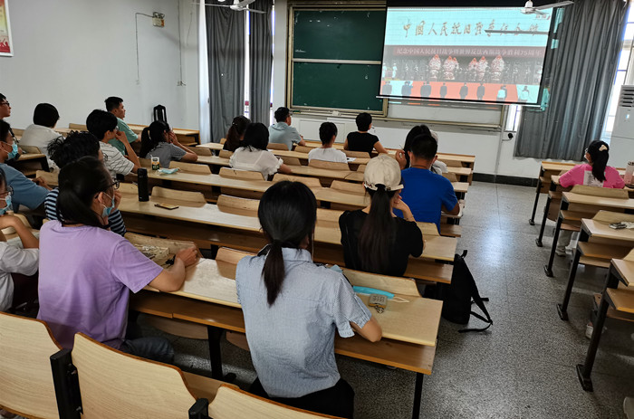 本网讯9月3日上午,人文社会科学学院组织师生在院202教室集体观看纪念抗战胜利75周年直播,学院党政领导、部分教师、学生代表参与直播观看。