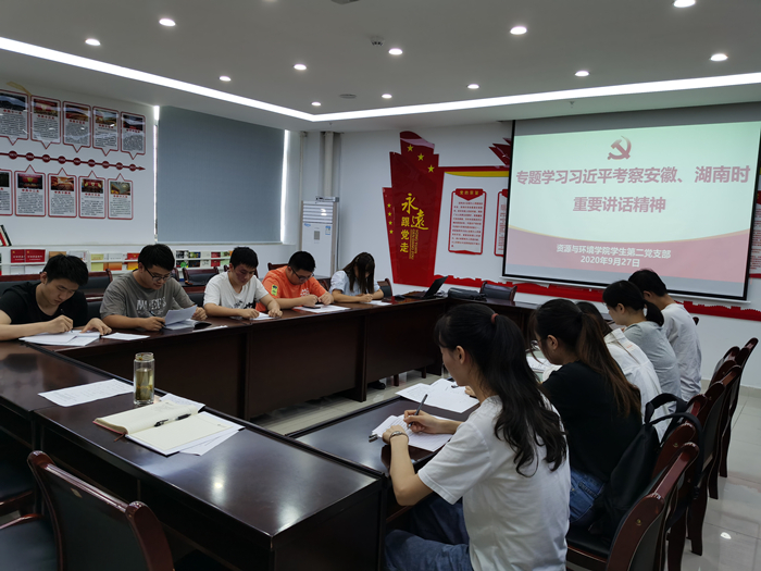 本网讯9月27日下午,资源与环境学院学生第二党支部在中西部工程楼南楼503党员活动室集中学习习近平总书记考察安徽、湖南时重要讲话精神。