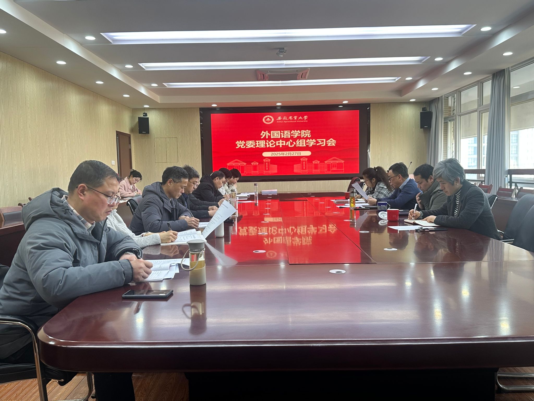 本网讯 2月27日下午,外国语学院召开党委理论学习中心组学习会。学院党政领导、党委理论学习中心组成员参会。会议由学院党委书记何如海主持。