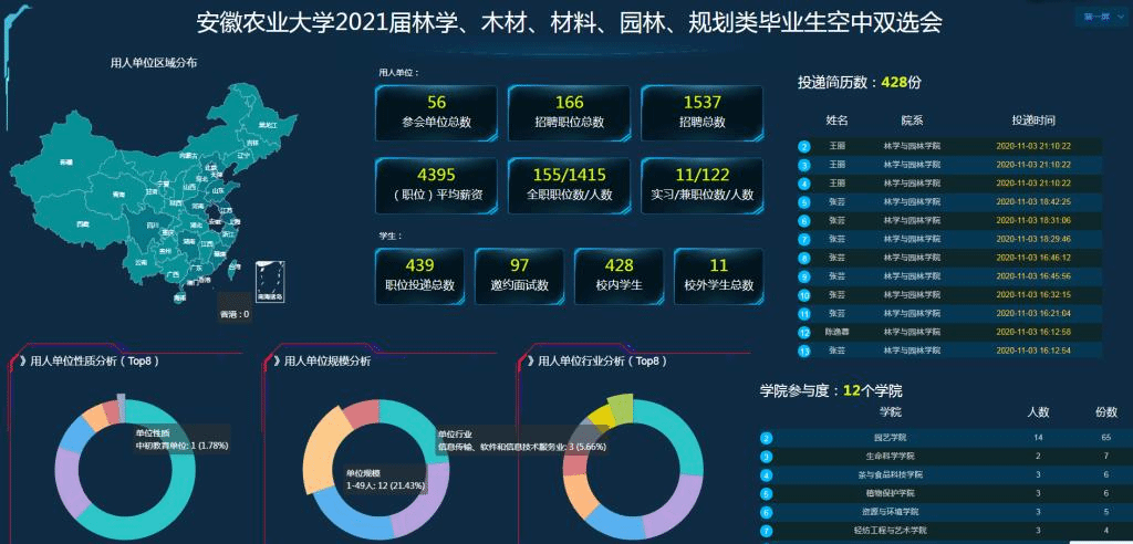10月28日—11月3日,学院依托就业宝平台顺利举办 “安徽农业大学林学、园林、规划、木材、材料”空中双选会。前期学院全方位发动辅导员、专业教师、校友等群体,邀请优质企业参会。最终在报名的企业中遴选出东华生态、美克美家、丰林集团、中农富通、五矿矿业、杭州园林等优质用人单位56家,计划招聘1567人。本场双选会浏览量达20857次,毕业生通过平台投递简历439份,邀约面试97次,当场达成就业意向2人。全校有12个学院参与此次空中双选会,多名北京理工大学、安徽师范大学等其他兄弟院校毕业生参加。