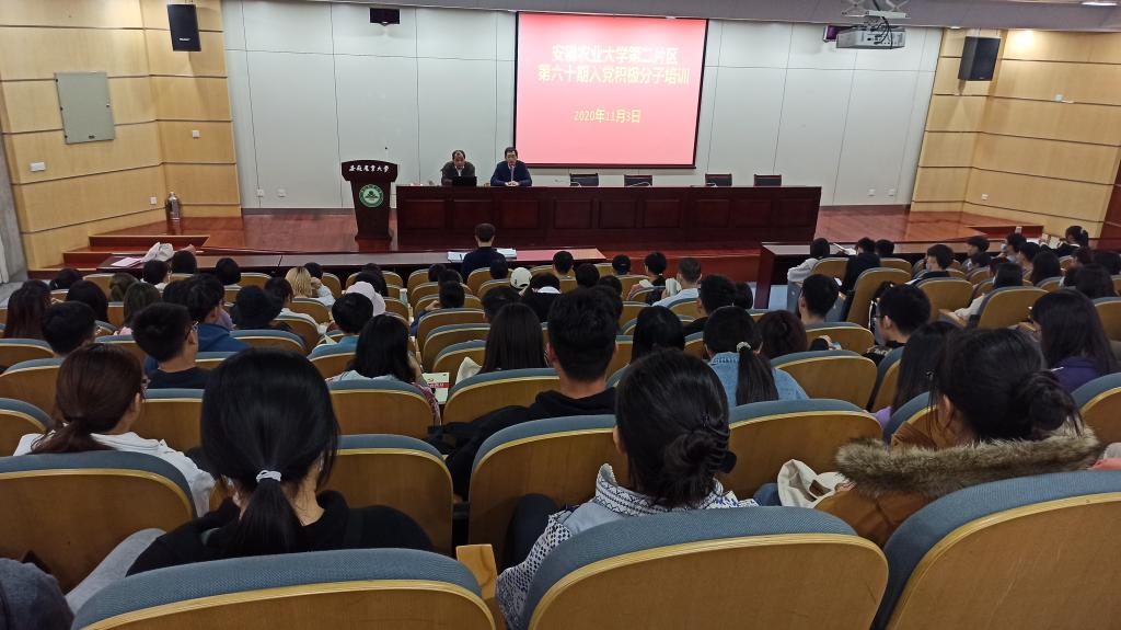 本网讯 11月4日晚,安徽农业大学第二片区分党校第60期入党积极分子培训班于图书馆二号报告厅举行,动物科技学院党委书记曹俊为第二片区全体入党积极分子授课。第二片区分党校班主任和第二片区分党校第60期入党积极分子参加了专题培训,会议由轻纺工程与艺术学院党委书记夏成云主持。