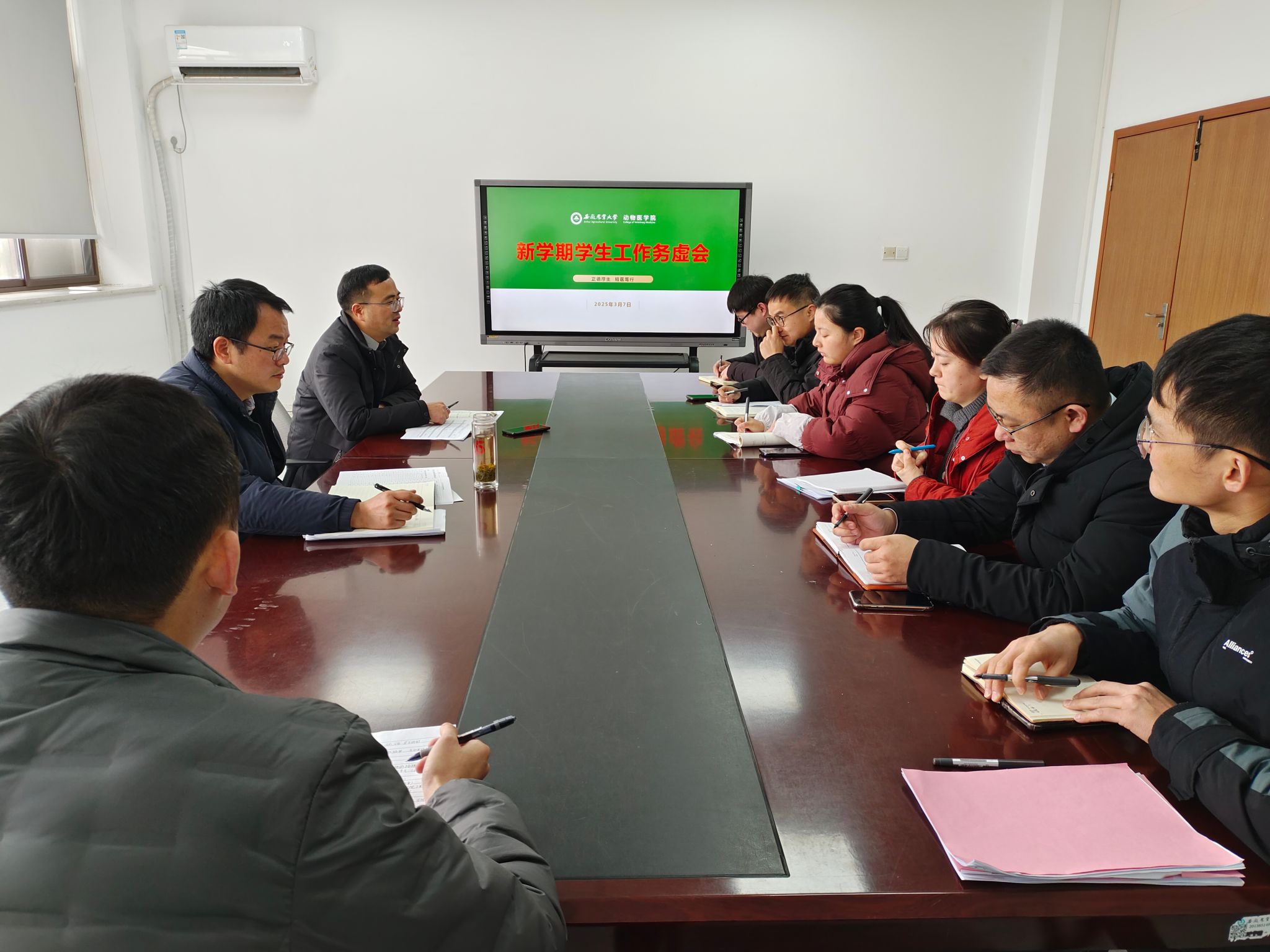 本网讯 3月7日上午,动物医学院在三楼会议室召开新学期学生工作务虚会,研究部署新学期学生工作。学院党委书记吴永红出席,全体专兼职辅导员参会。会议由学院党委副书记张锐主持。