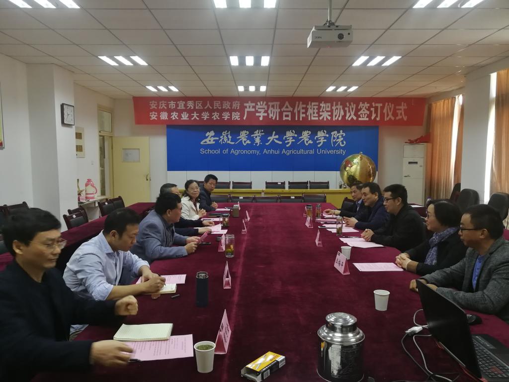 本网讯11月9日上午,安庆市宜秀区人民政府与安徽农业大学农学院产学研合作框架协议签约仪式在农学院十教518会议室举行。宜秀区人民政府副区长马韬、区农业农村局副局长胡浩、区种植业管理中心主任马光荣、宇顺高科种业股份有限公司董事长汪梅平,农学院党委书记管志权、正处级组织员汪凤莲、院长李金才、党委副书记副院长吕大鹏、周可金教授、朱宗河副教授等出席了签约仪式。