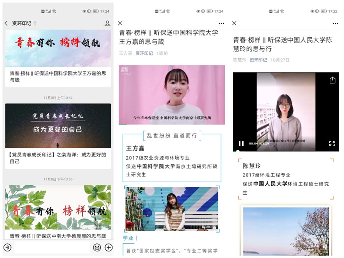 前期,学院学生党支部组织2017级24名获得推荐免试研究生资格的同学分别围绕大学期间学业规划、学习方法、创新创业竞赛、科研经历、社会实践、成长感悟等内容录制《青春·榜样》专题视频,向低年级学生传经送宝,为他们的思想、学习、工作、生活提供借鉴与指导,鼓励他们坚定理想信念、合理设定奋斗目标,刻苦学习、积极实践、重视积累,在资环学院成就更好的自己。