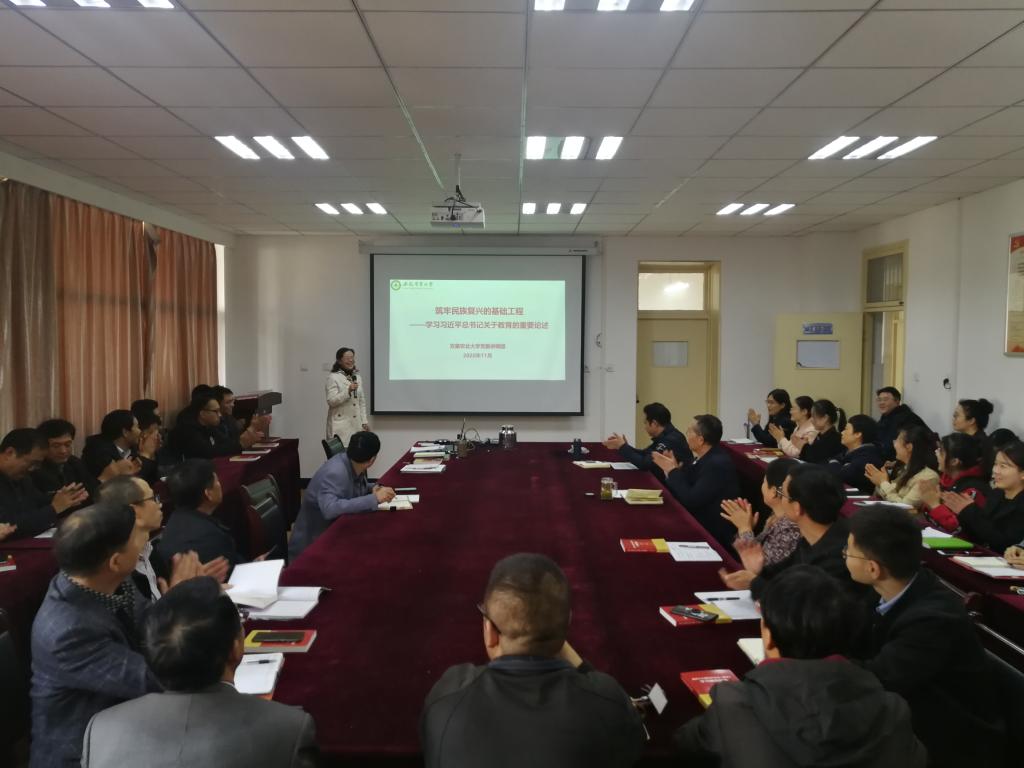 会上,汪凤莲作了题为“筑牢民族复兴的基础工程——学习习近平总书记关于教育的重要论述”的宣讲报告。汪凤莲从习近平总书记教育重要论述思想体系形成过程、内容体系的“九个坚持”及我校的实践思考等三个方面作了报告。同时强调,学习宣传贯彻习近平总书记关于教育的重要论述精神,是我们当前和今后一个时期重大任务。要在解决“为谁培养人”的问题,做“对的教育”;解决“培养什么人”的问题,做“好的教育”;解决“怎样培养人”的问题,做“强的教育”上多思考、下功夫。要扎根中国大地办教育,要坚持创新发展之路,要坚持学校“科教融合、产学结合”的特色办学理念,走出育人兴校、富民强农、校地协同特色发展之路。