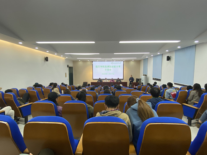 本网讯11月19日晚,园艺学院在二教245报告厅举行选调生经验分享交流会。出席本次会议的有学院党委副书记、副院长鄢高翔,学院团委老师以及选调生代表王洁、梁赛、汪琳、王语思,学院学生党员、各班级学生骨干等100余人参加本次交流会。