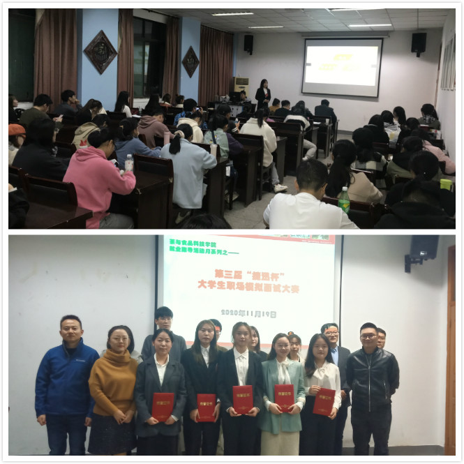 本网讯 11月19日晚,茶与食品科技学院在茶业楼105会议室举办第三届“捷迅杯”大学生职场模拟面试大赛。招生就业处等单位老师担任本次比赛评委,学院办公室老师主持了本场比赛。