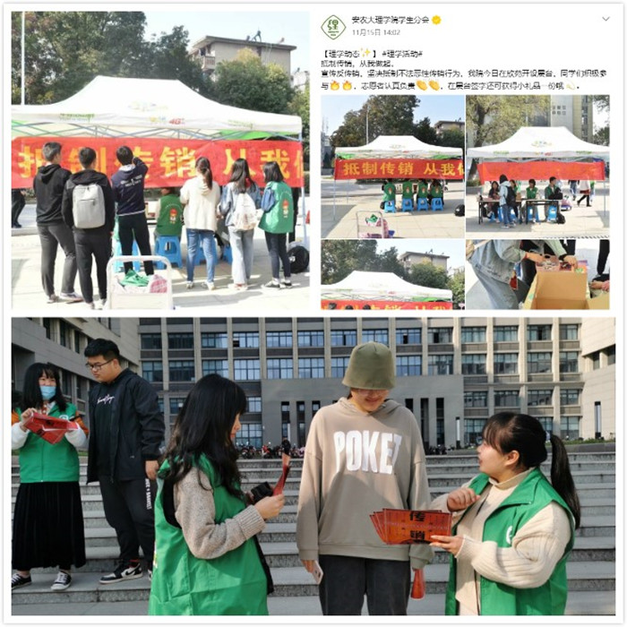 学院利用团干部培训等形式,观看著名反传销“斗士”李旭名为《反传销之战》的演讲视频,让学生骨干更加直观地辨别传销,并通过学生骨干形成“以点带面”的扩散效应,在学生群体中形成自觉抵制传销的良好氛围,做到知法、懂法、守法,增强学生对传销的免疫力。