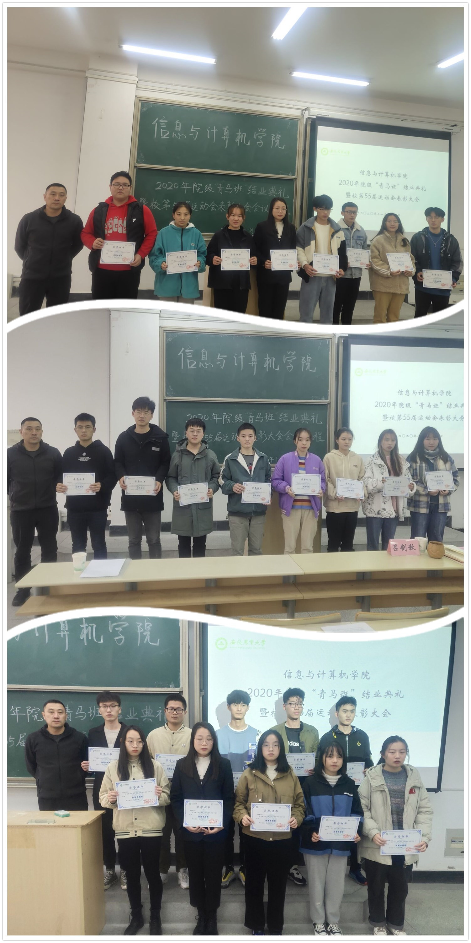 本网讯 为进一步树立典型、激励先进、总结经验、发扬成绩,近日,信息与计算机学院在经济楼202教室举行院级“青马班”结业典礼暨校第55届运动会表彰大会。学院党委副书记、纪委书记、副院长吕剑秋出席了会议,并为参加会议的同学上了一堂生动团课。学院团委老师、2020年院级“青马班”学员、校第55届运动会运动员、志愿者及学院学生组织代表参加了大会。
