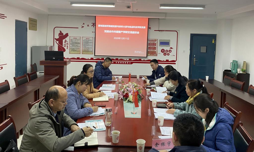 本网讯2020年12月11日,蒙城县板桥集镇党委书记荀宏一行来我校茶与食品科技学院对接党建暨产学研工作并座谈,院党委书记唐红萍、安徽省农产品加工工程实验室常务副主任梁进、食品学科相关老师参加了座谈会。座谈会由梁进主持。