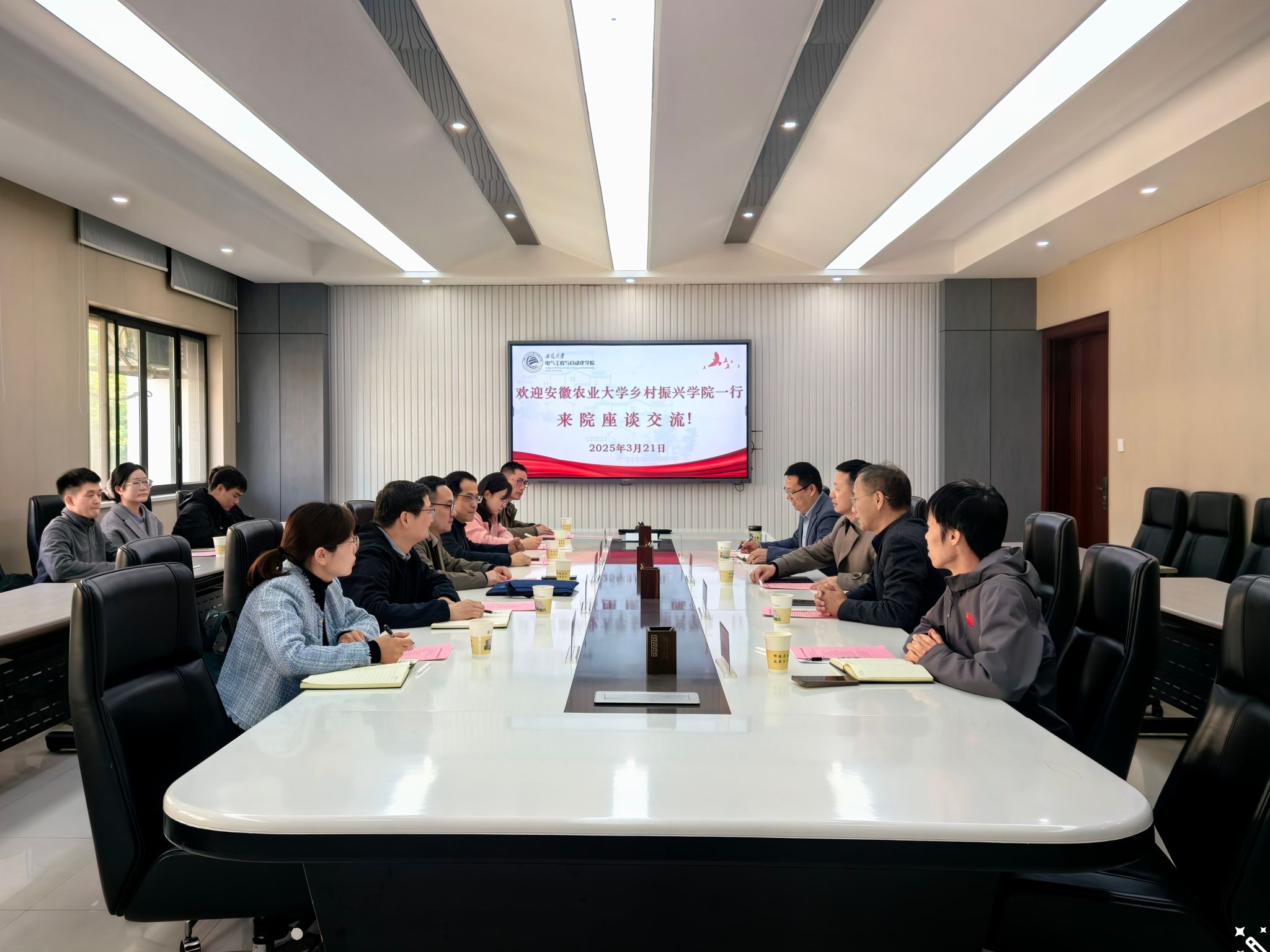 本网讯 为加强对外交流与合作,促进我院党团和学科建设,3月21日上午,乡村振兴学院党总支书记张晓伟、副院长徐峰、继续教育学院副院长李玮以及相关师生一行赴安徽大学电气工程与自动化学院调研交流。安徽大学电气工程与自动化学院党委书记毕涛、副院长潘天红、副书记杨海峰、副院长陆思良参加座谈。会议由安徽大学电气工程与自动化学院党委书记毕涛主持。