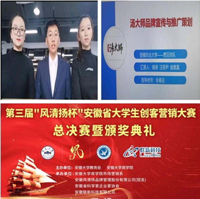 本网讯在刚刚结束的第三届“风清扬杯”安徽省大学生创客营销大赛总决赛中,我校经济管理学院商务管理系徐春迎老师指导的“汤大师品牌宣传推广策划”和“提高疫情常态下研磨时光咖啡销量”两个作品分别获得特等奖和优秀奖。