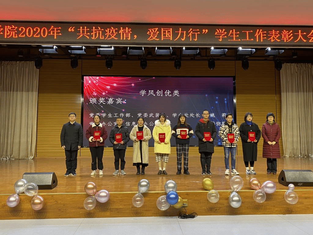 在学生工作表彰环节,参会嘉宾依次为学院体育运动、社会实践、先进集体、创新创业和学风创优等方面表现突出的先进典型进行表彰,包括国家奖学金、励志奖学金获得者、学生创业团队、校十佳班级、红旗团支部、疫情防控志愿者、防汛抗洪志愿者、暑期“三下乡”实践团队、志愿服务团队、获奖运动员等。