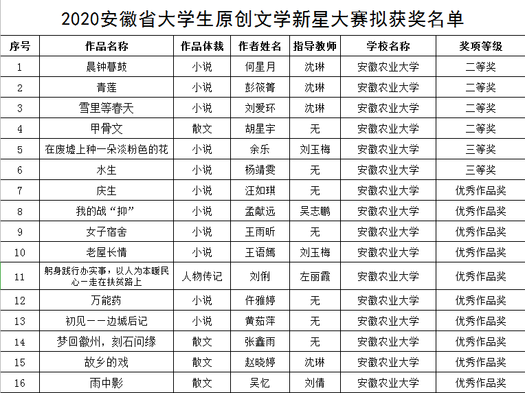 又讯近日,2020年安徽省大学生原创文学新星大赛评选结果揭晓,人文社科学院参赛作品荣获二等奖4项,三等奖2项,优秀奖10项,较去年获奖作品数量增长一倍,取得参加此项赛事以来的最佳成绩。