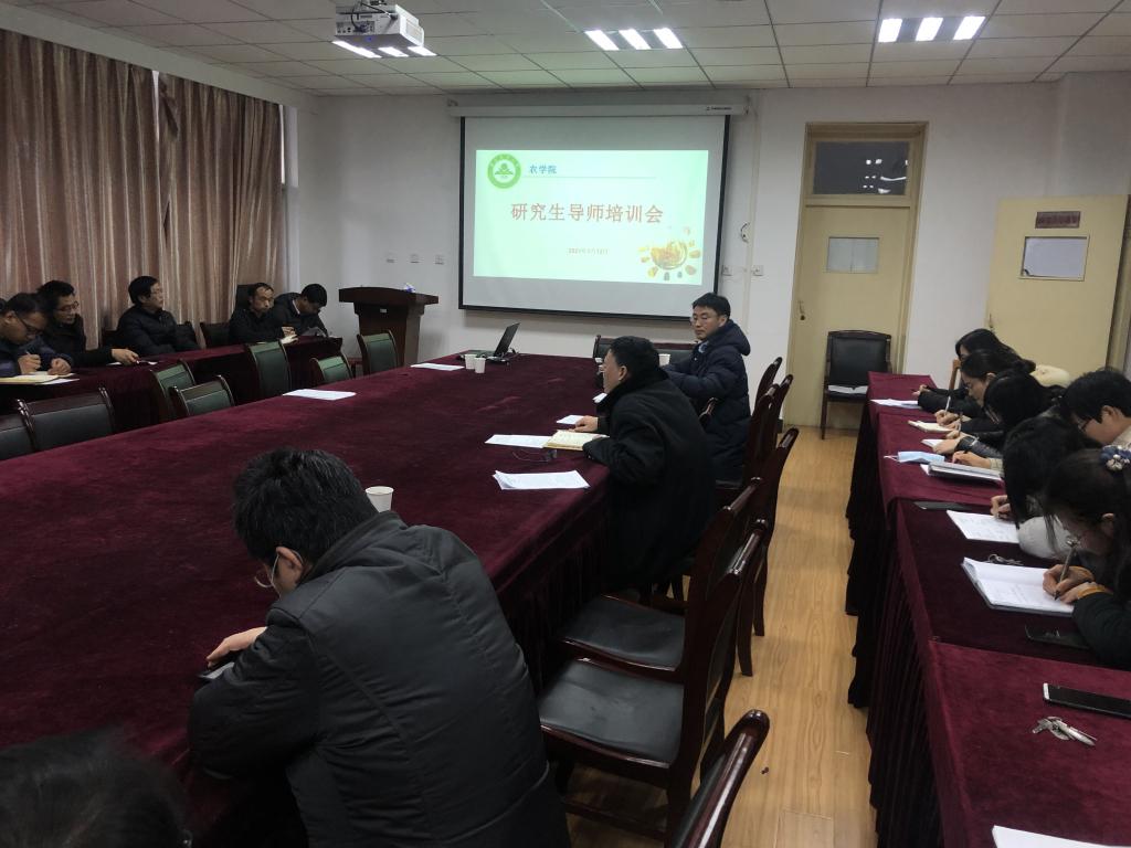 本网讯为深入学习习近平总书记关于研究生教育的重要指示精神,全面贯彻全国研究生教育会议、安徽省和学校研究生教育工作推进会精神,落实立德树人根本任务,深化农学院研究生教育教学改革,规范指导行为,努力造就有理想信念、有道德情操、有扎实学识、有仁爱之心的新时代优秀导师。1月12日下午,学院召开了2020年度研究生导师培训会。研究生院学位办主任徐伟、生命科学学院徐家萍教授应邀到会指导,农学院党政领导、院学术分委员会成员、支部书记和系主任、全体研究生导师参加本次会议,会议由农学院副院长王晓波教授主持。