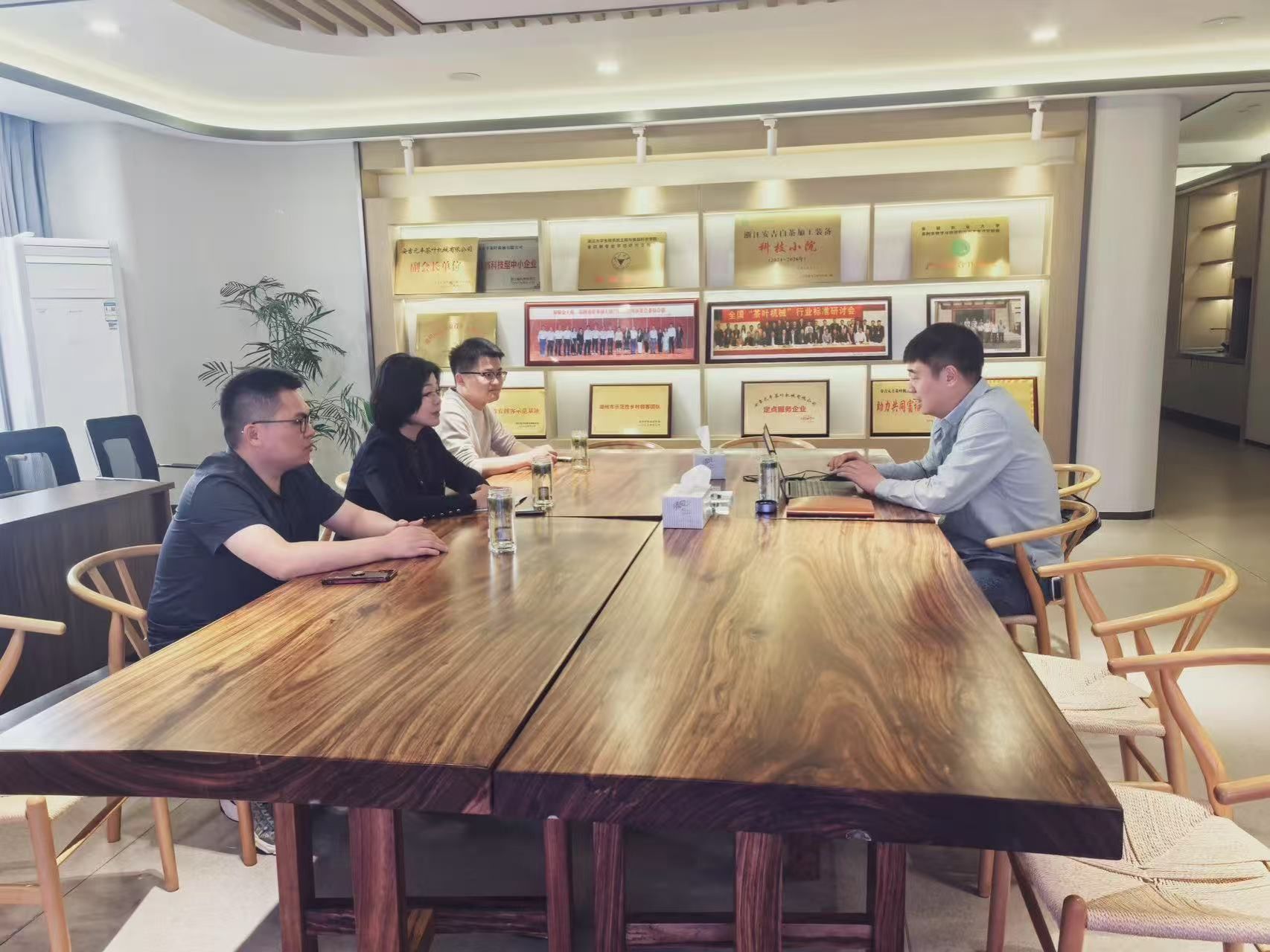 在安吉宋茗白茶有限公司,邓威威与实习学生亲切交流,详细询问他们在企业的工作内容、生活保障及实践收获。学生们结合岗位实践,分享了在茶叶加工技术、质量品控等环节的所学所悟。邓威威对同学们的实习表现给予充分肯定,她强调,生产实习是茶学专业人才培养的重要环节,希望大家珍惜实践机会,主动扎根产业一线,在实操中锤炼本领、积累经验,将课堂所学转化为服务产业的能力。在安吉元丰茶叶机械有限公司,邓威威一行参观了智能化生产车间、技术研发中心,深入了解茶叶机械装备的自动化生产流程及数字化技术应用。双方围绕“人才培养、技术创新、成果转化”等主题展开座谈。企业负责人介绍了当前茶机行业向智能化、绿色化转型的趋势,希望与学院在智能装备研发、制茶工艺优化、茶园数字化管理等领域开展深度合作。邓威威表示,访企拓岗是学院落实高校服务产业发展的重要举措,学院将以企业需求为导向,持续优化课程体系,培养更多适应产业升级的高素质人才。